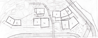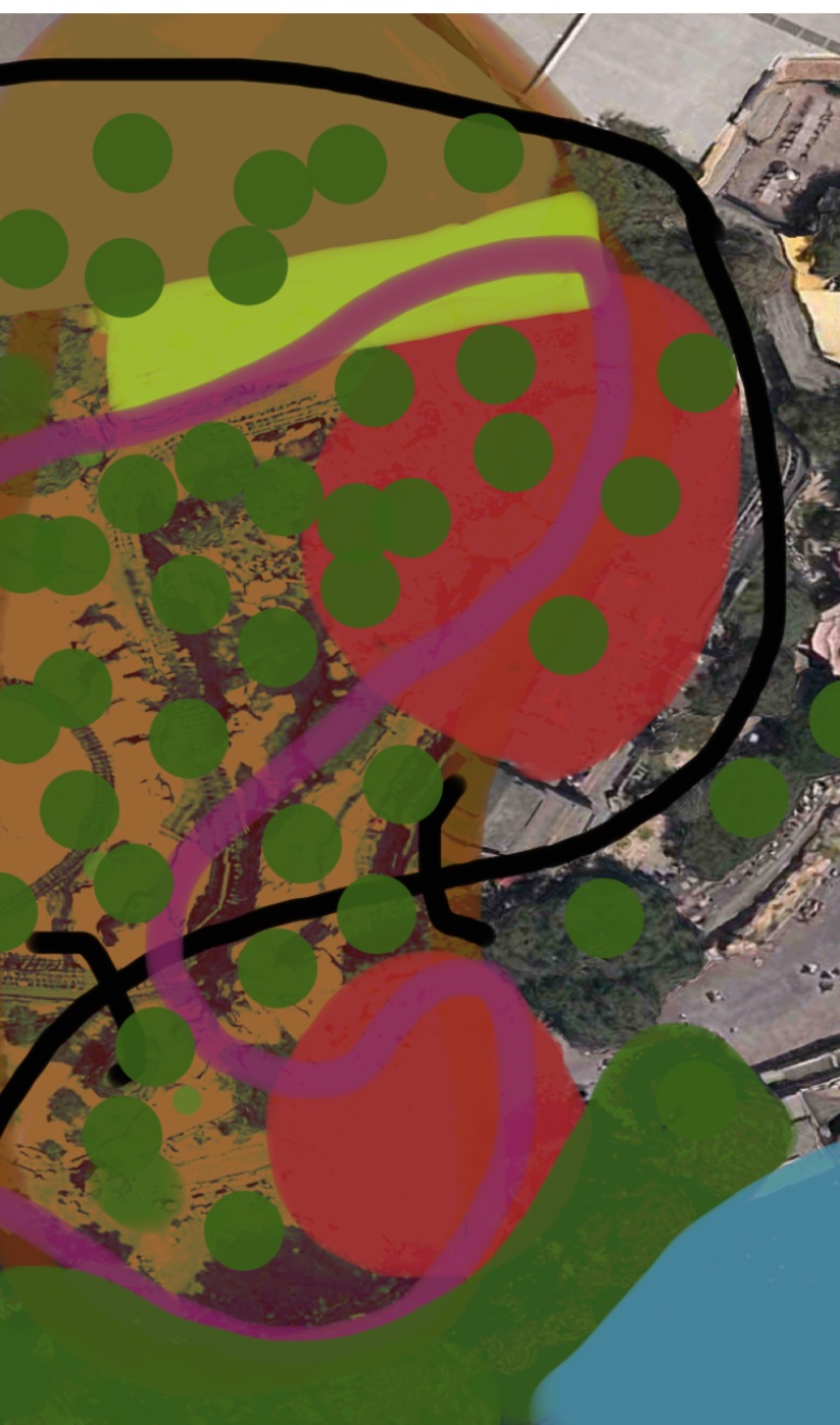 The red shows the site of the old Rainbow Ridge and the yellow is the current site of the town. The purple is the pack mule route and the black is the mine train. The brown is the large hill.