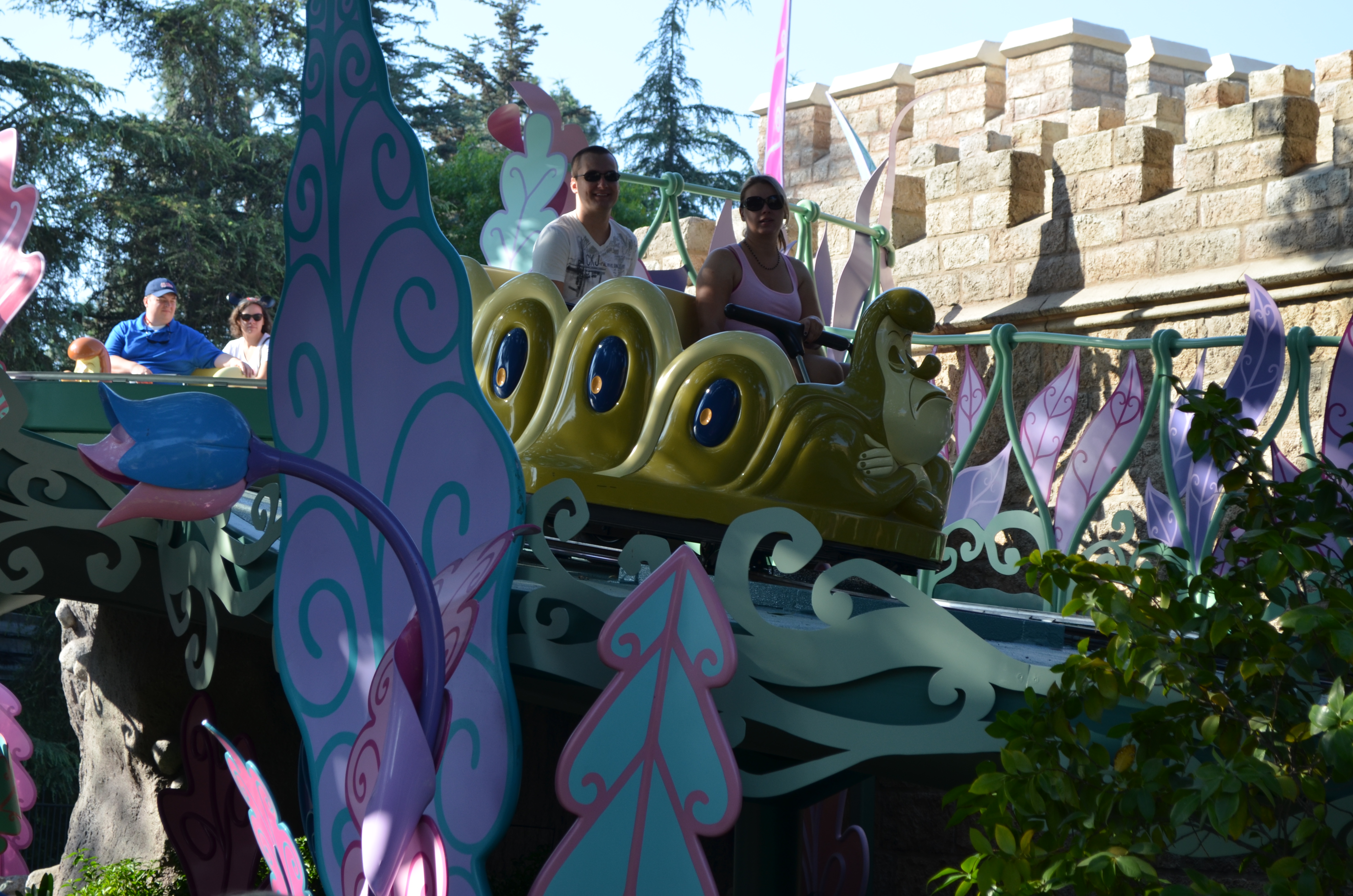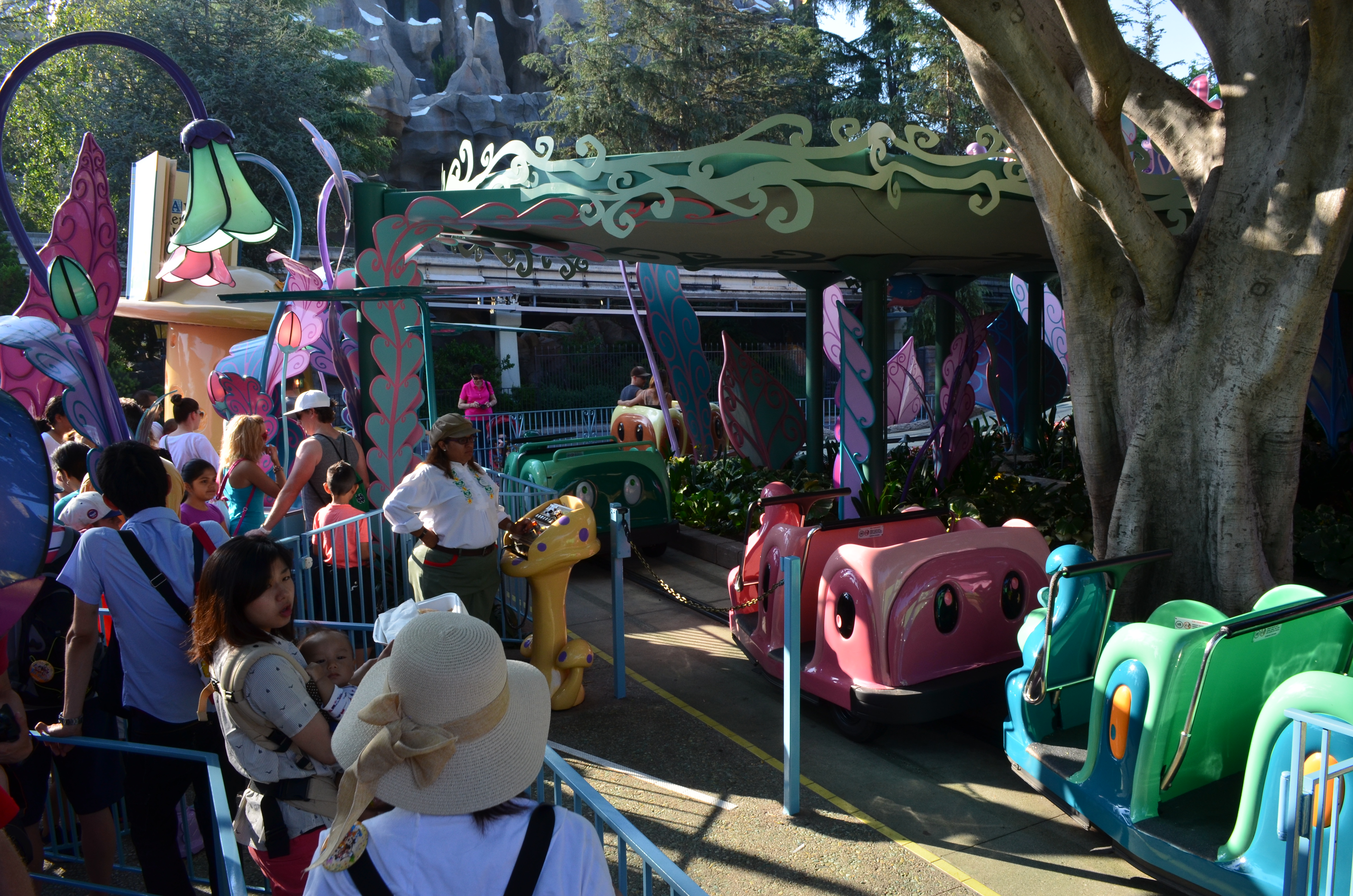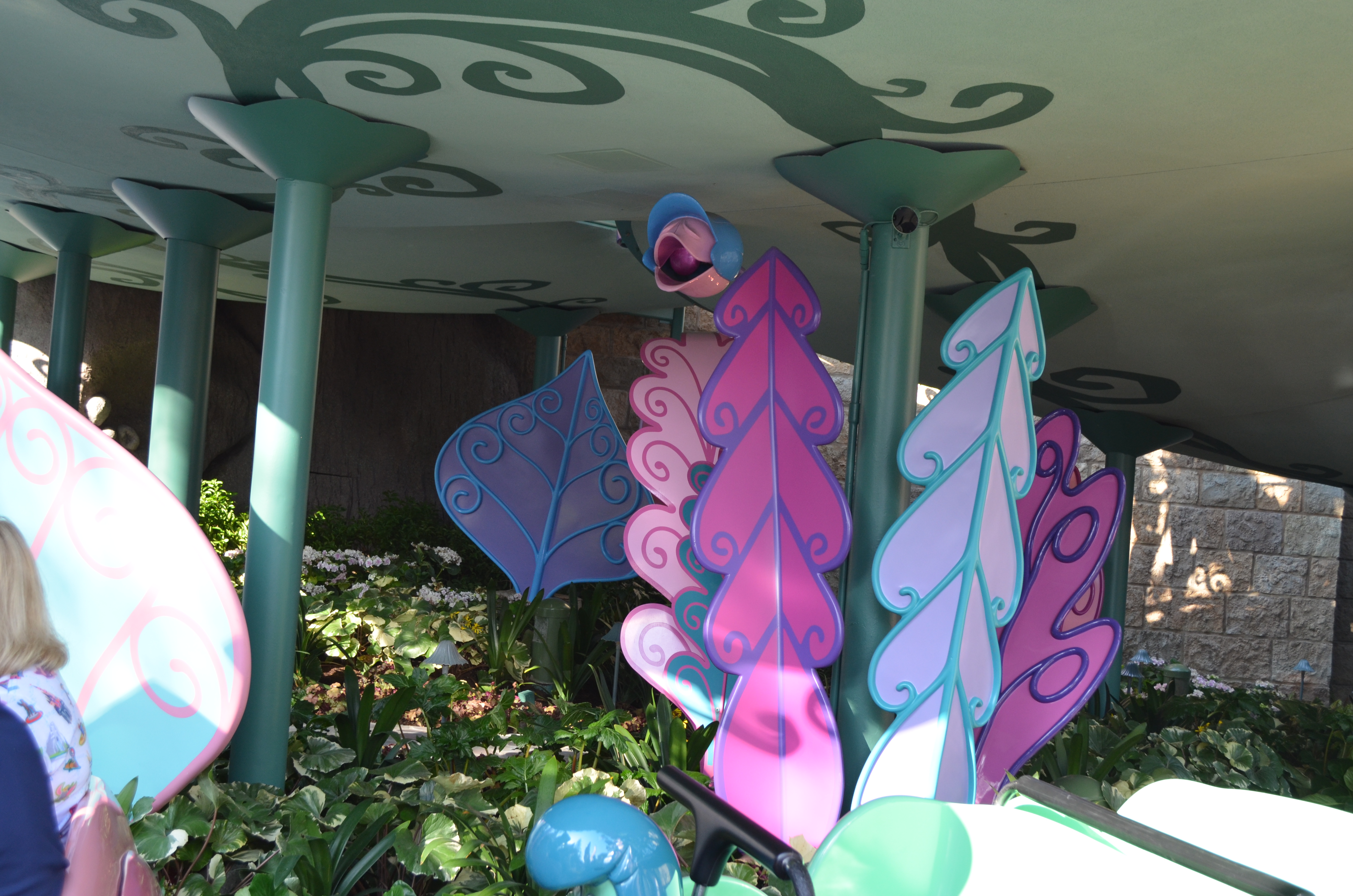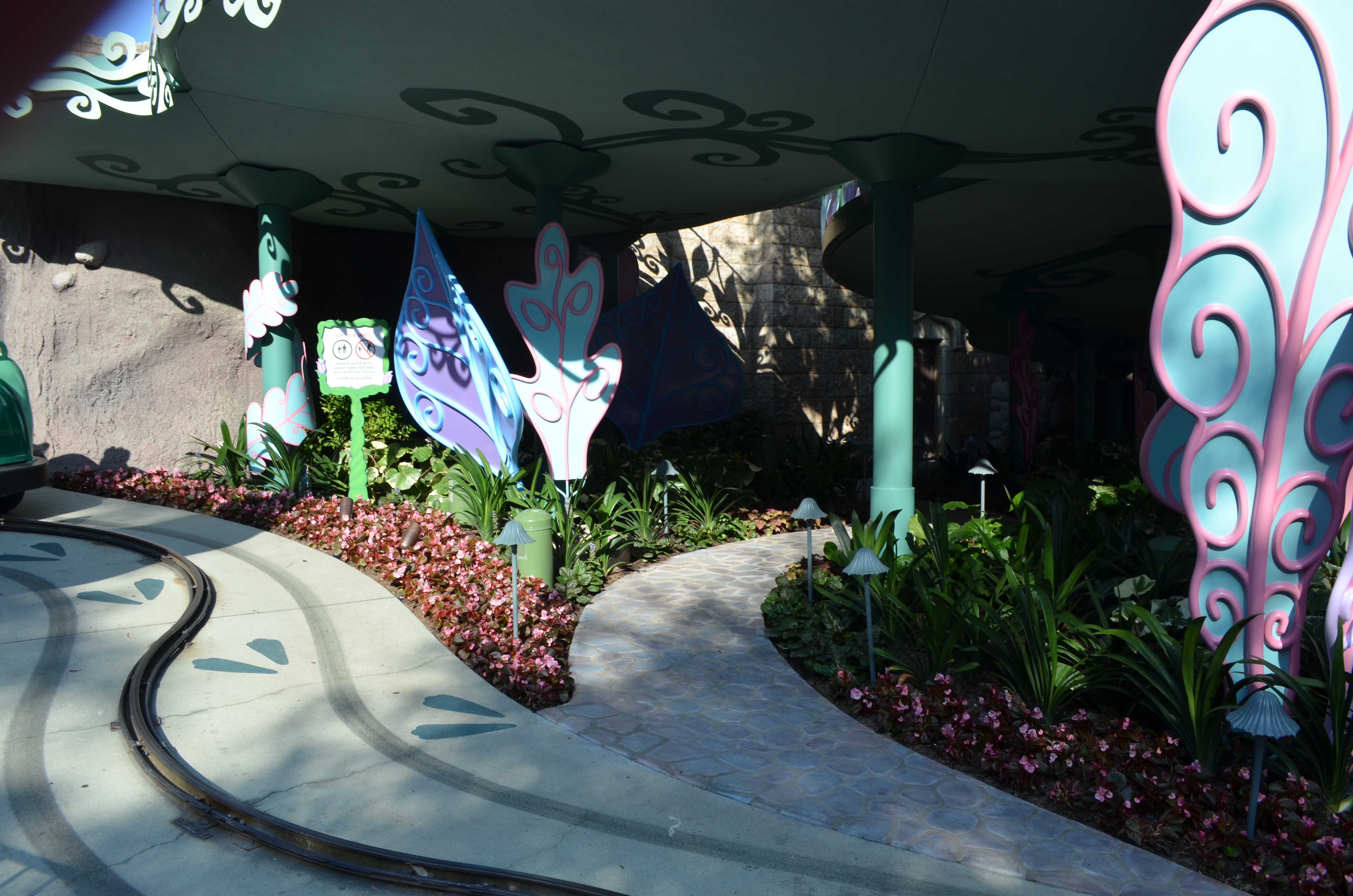 Alice in Wonderland reopened at Disneyland this week after a four month refurbishment. The main focus of the refurbishment was to make the outdoor section of track compliant with OSHA’s new standards. The attraction had temporary scaffolding placed on the outdoor section in 2010. Now the track “flows” together and is on one large ramping platform while maintaining the original layout. The attraction had a major refurbishment in 1983 and had many scenes changed or removed. The most recent refurbishment added many projections and new figures. This attraction has the best blend of projections and physical sets I’ve ever scene. They have animatronics and figures in the forefront and projections mostly add to the realism and bring the figures to life. For example, they have projections of flowers and butterflies dancing above and steam flowing out of teapots. They also added a screen with Alice chasing the White Rabbit. This part uses a technique call “squinching“. They even updated the last scene before the unload.
