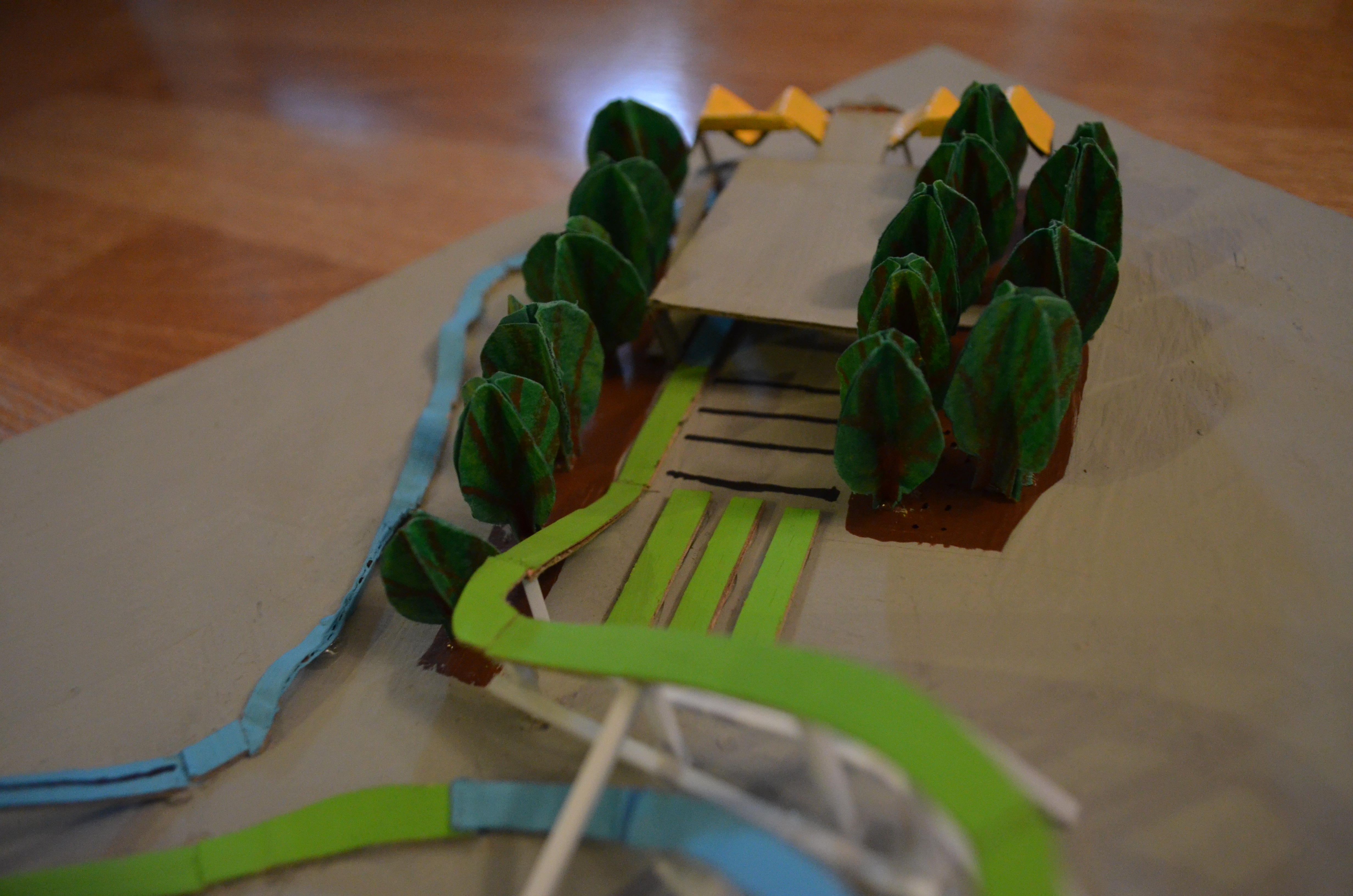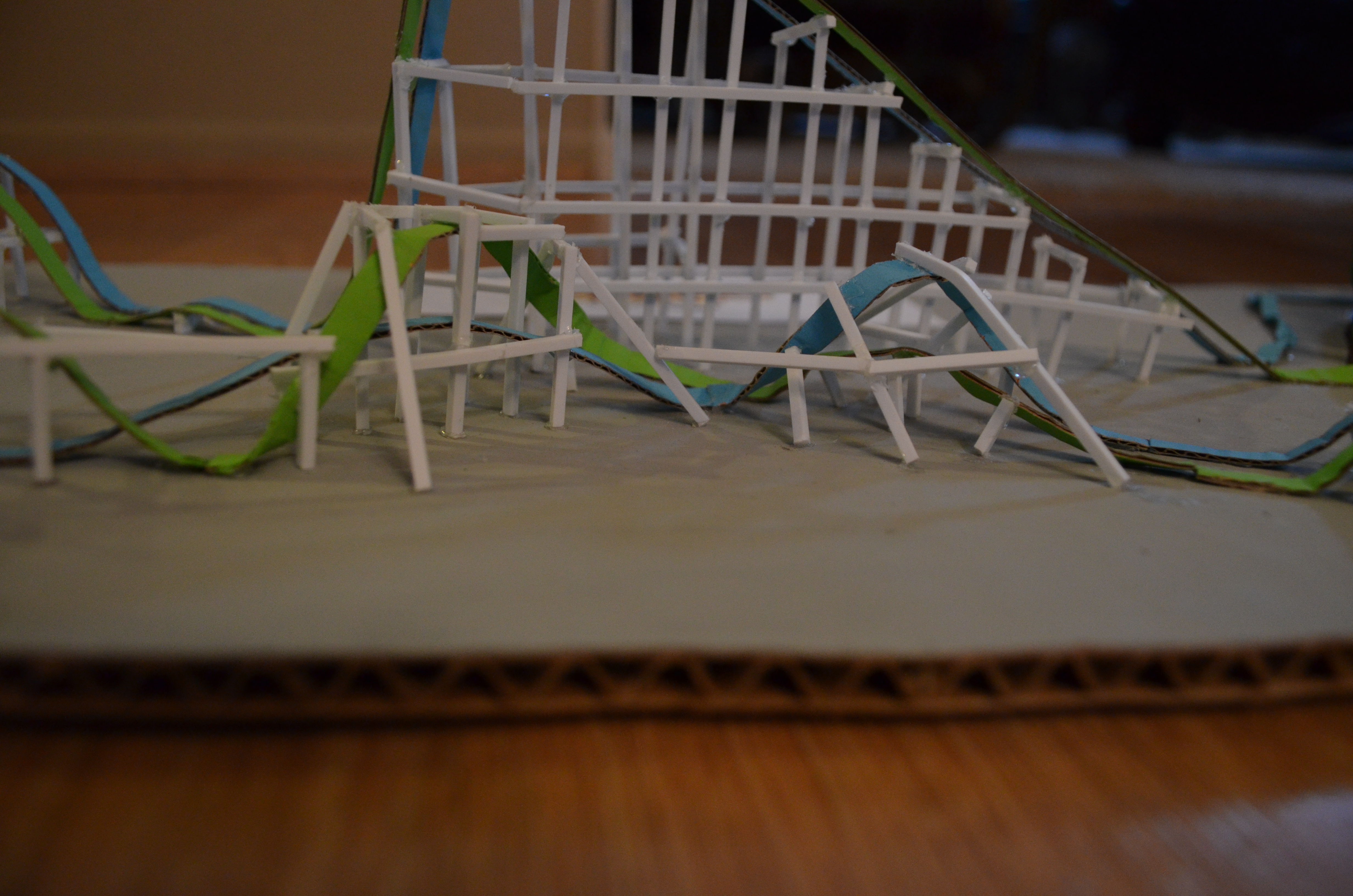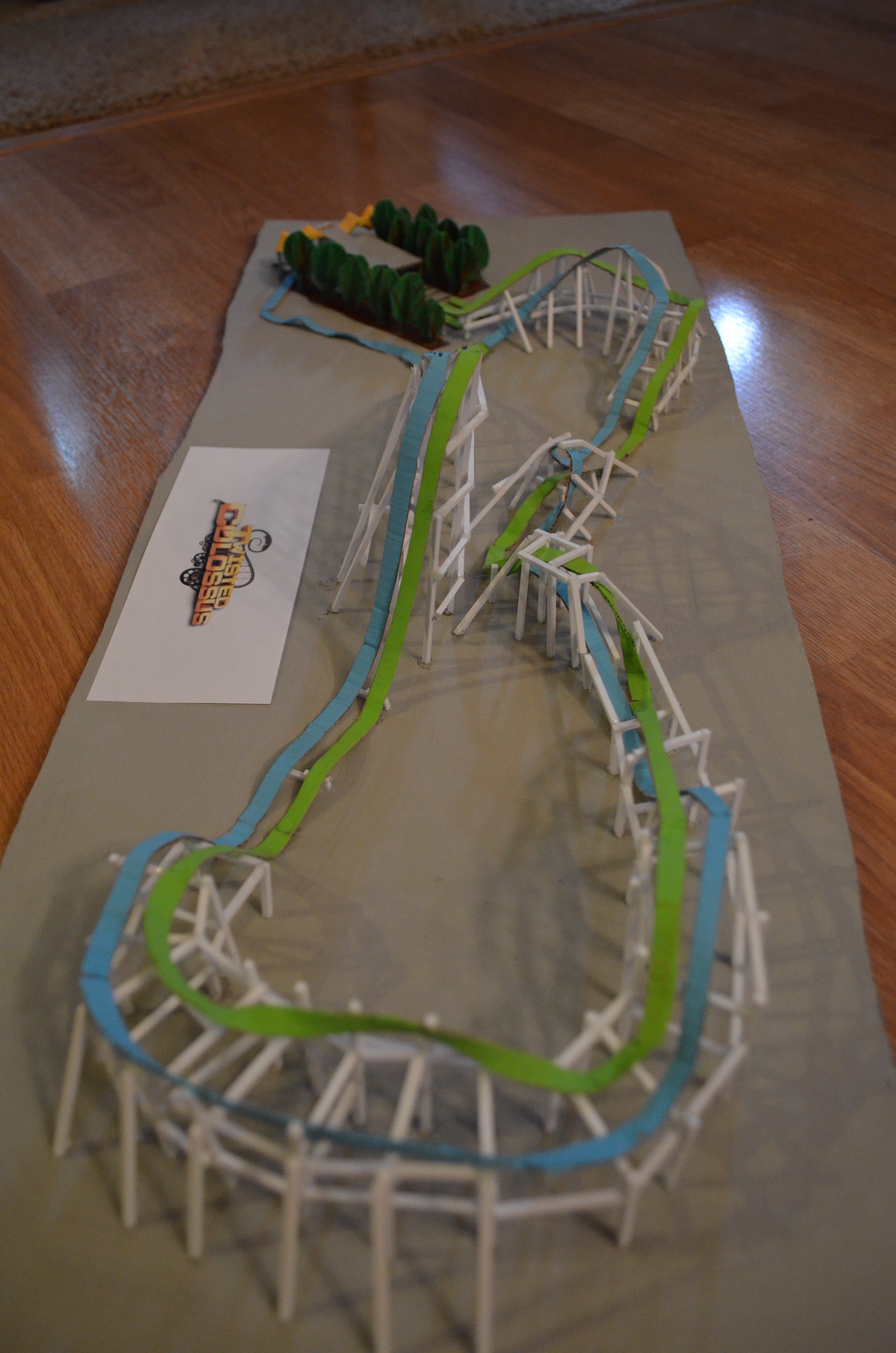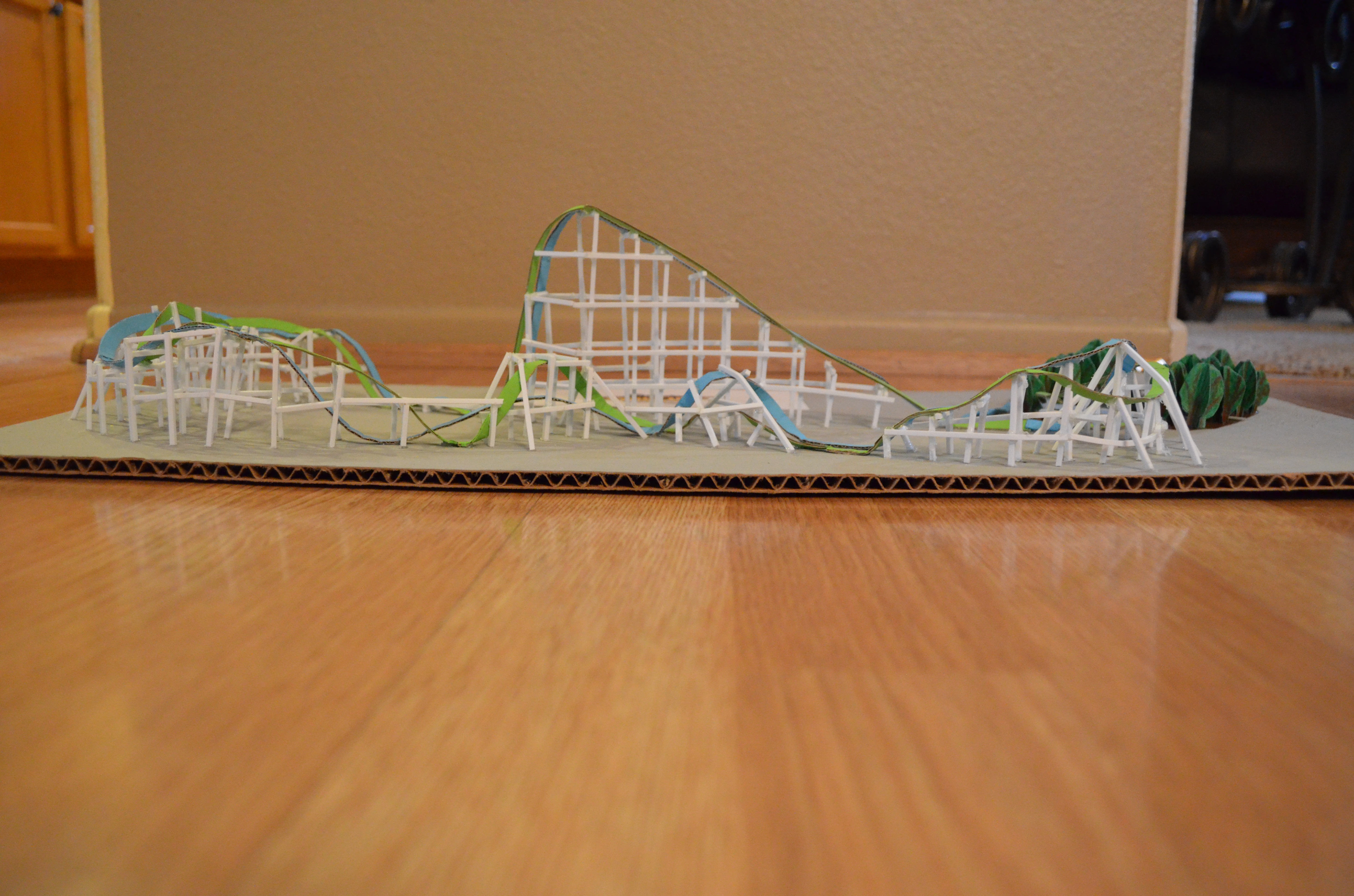 I made a model of the new coaster and used a new material in this model. I used white styrene strips to build the wooden frame of the coaster. I used cardboard strips to build the coaster track and station. This model is about two feet long and does not feature the turnaround for Goliath as I wanted the model to focus on the new ride.