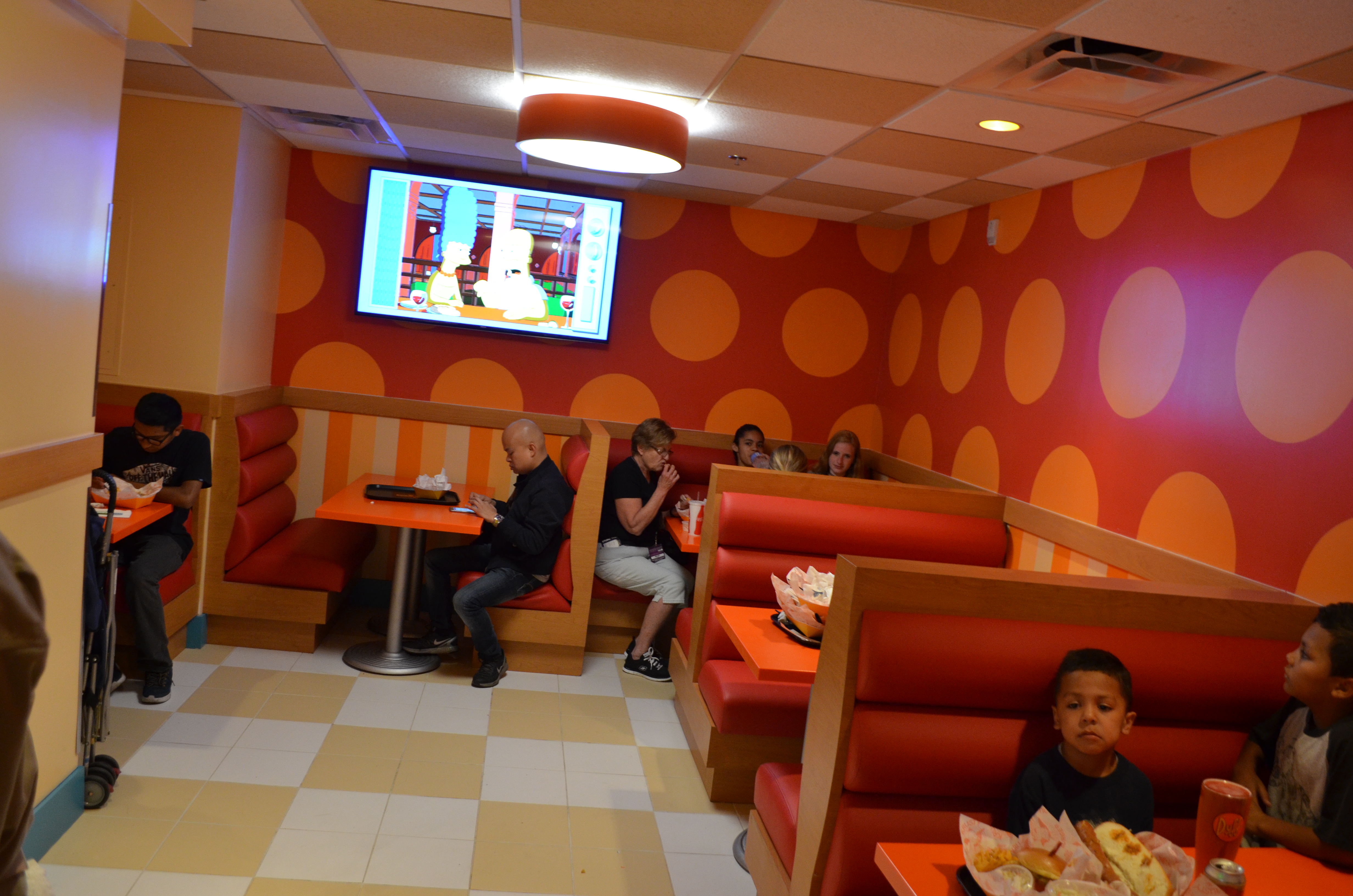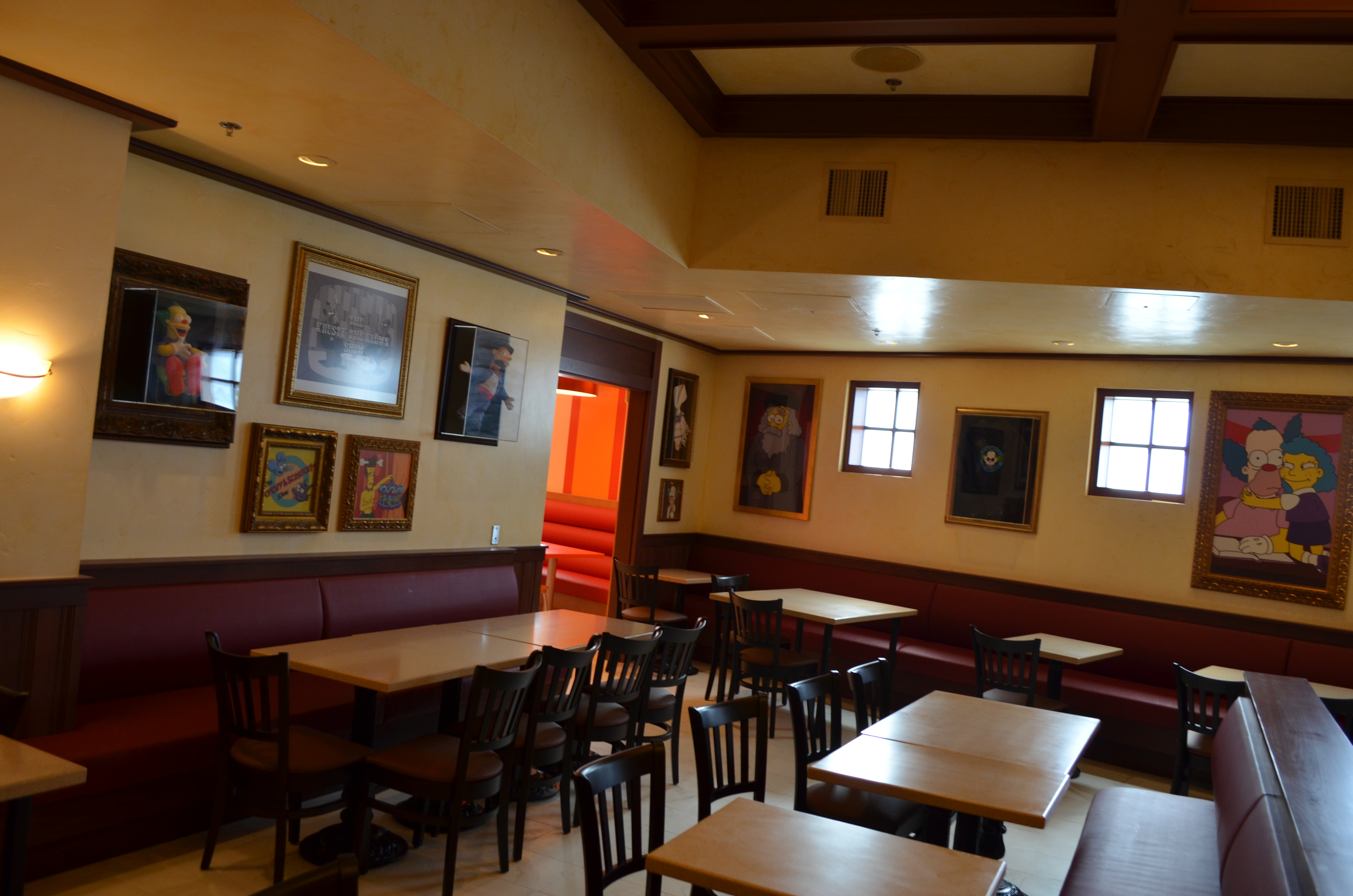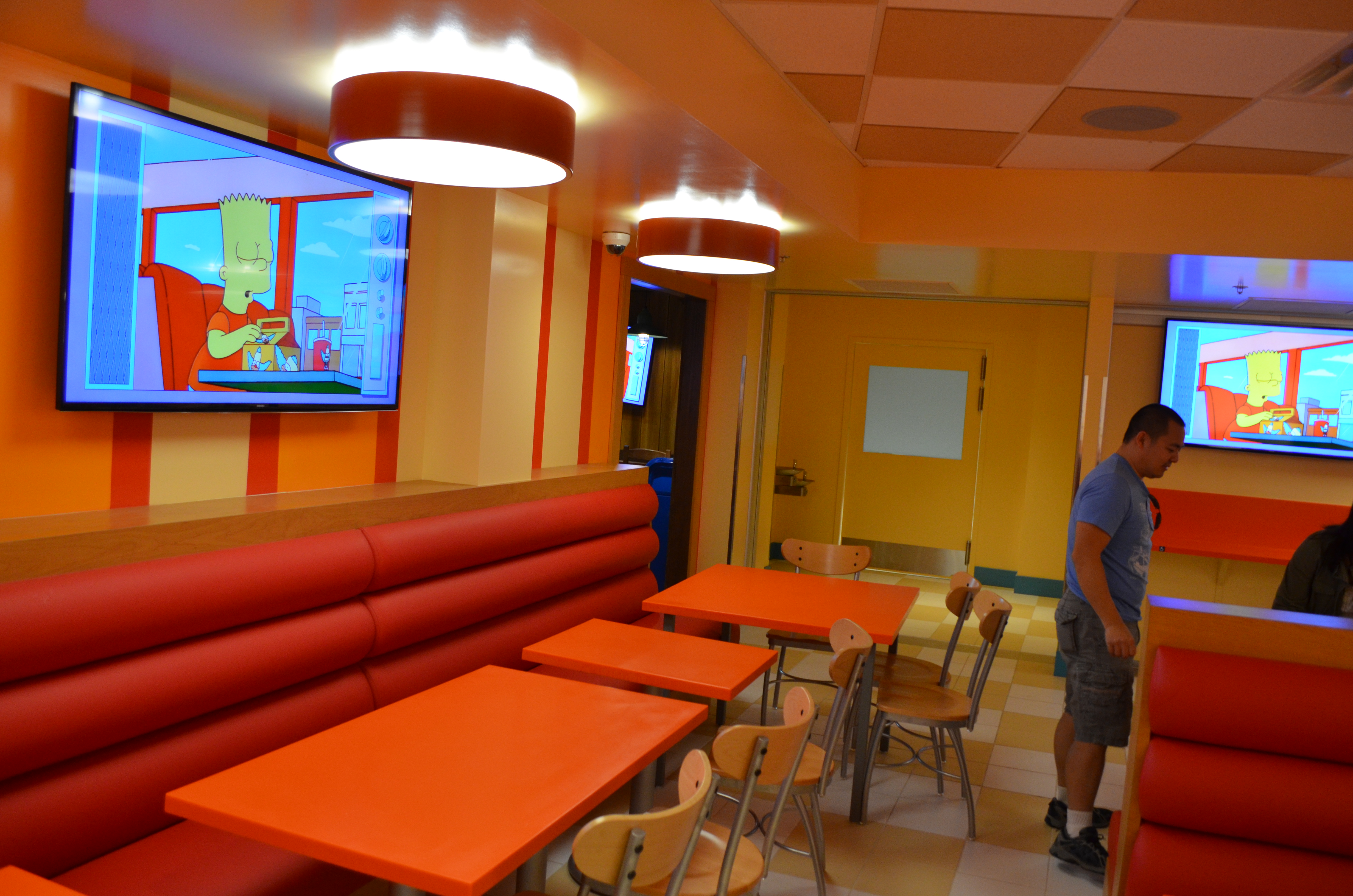 This section of the restaurants is the lesser themed of the two, more of a generic fast food look, but video monitors play a long look of Simpsons clips to keep you entertained.