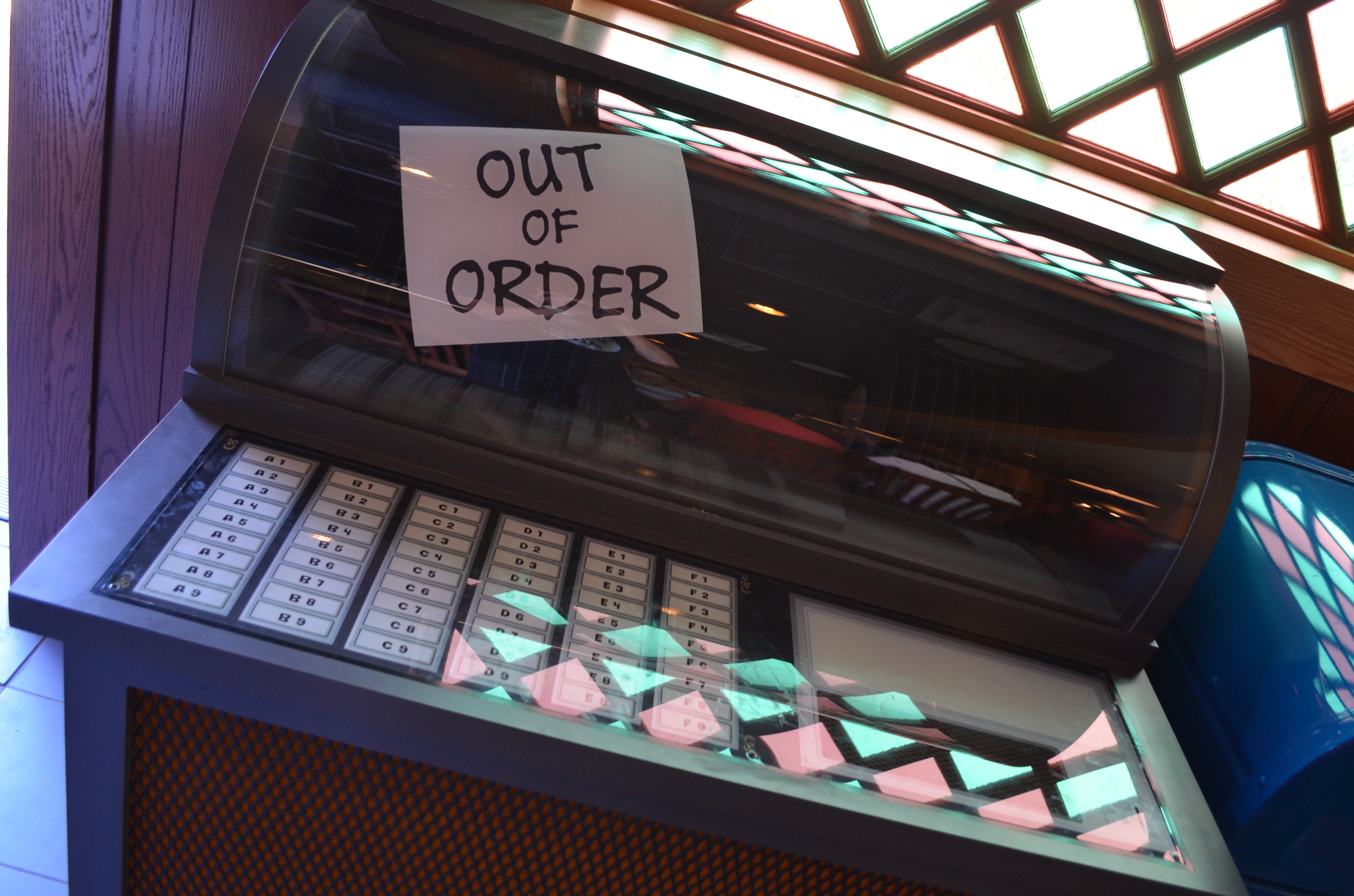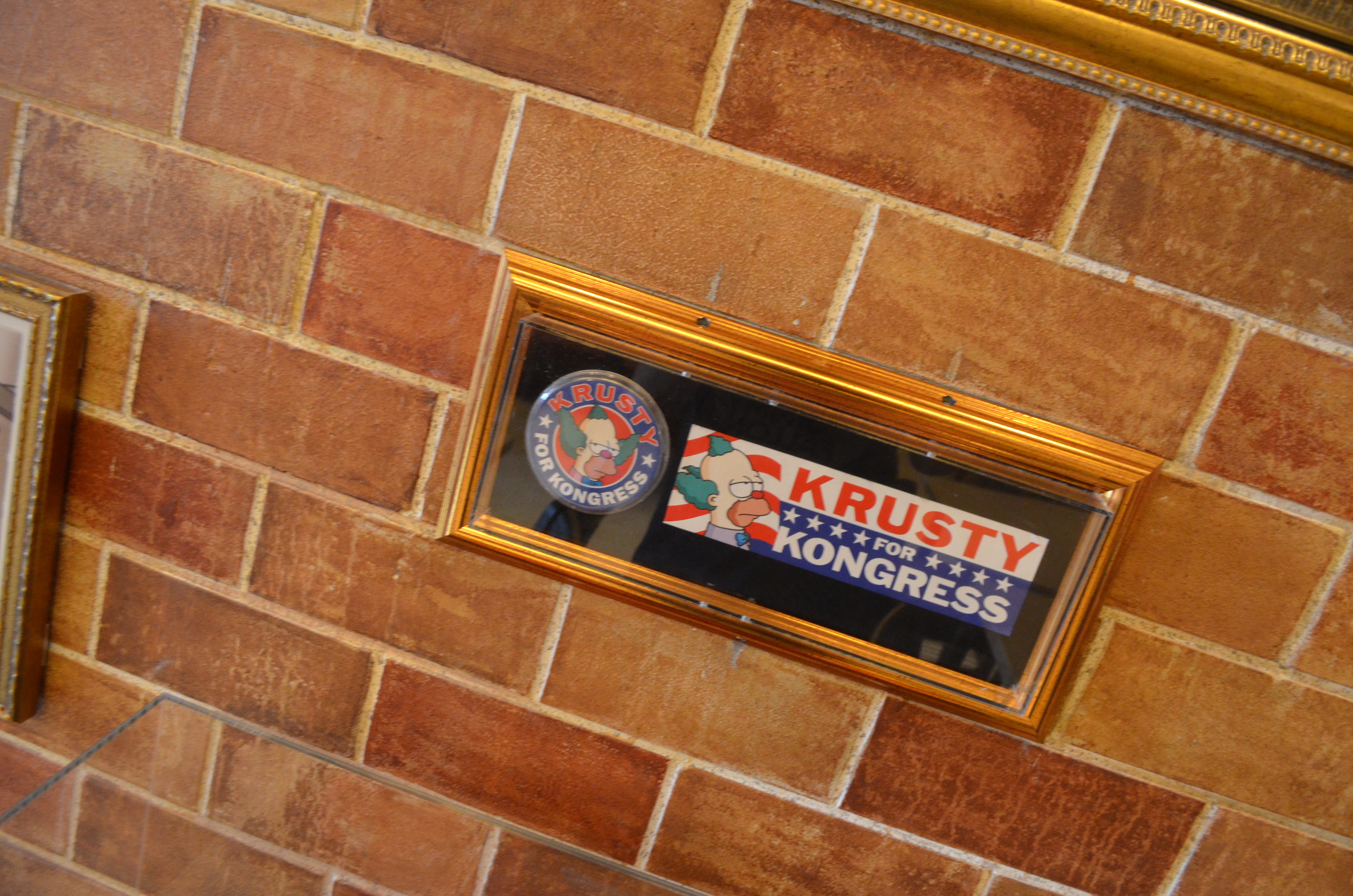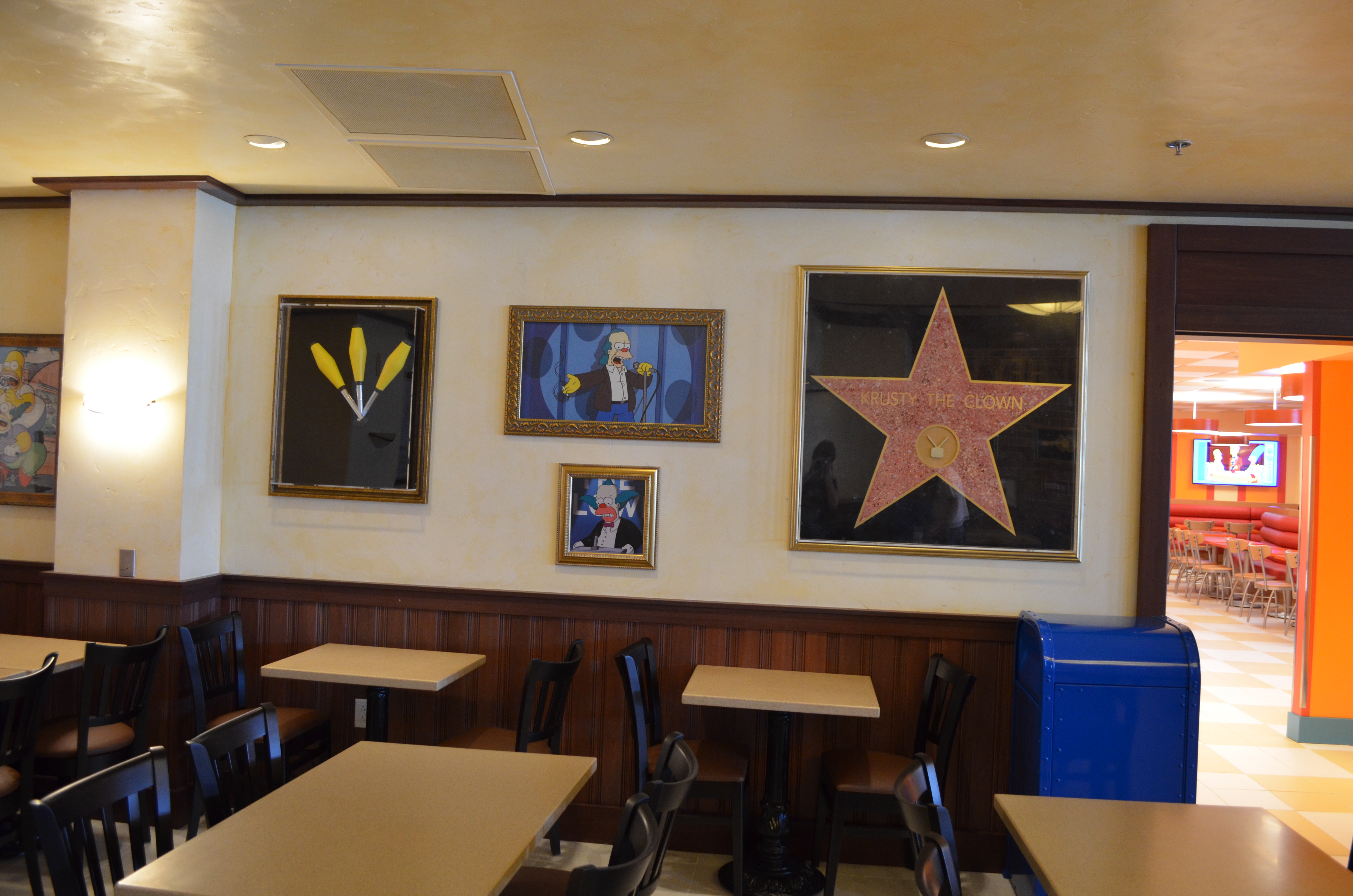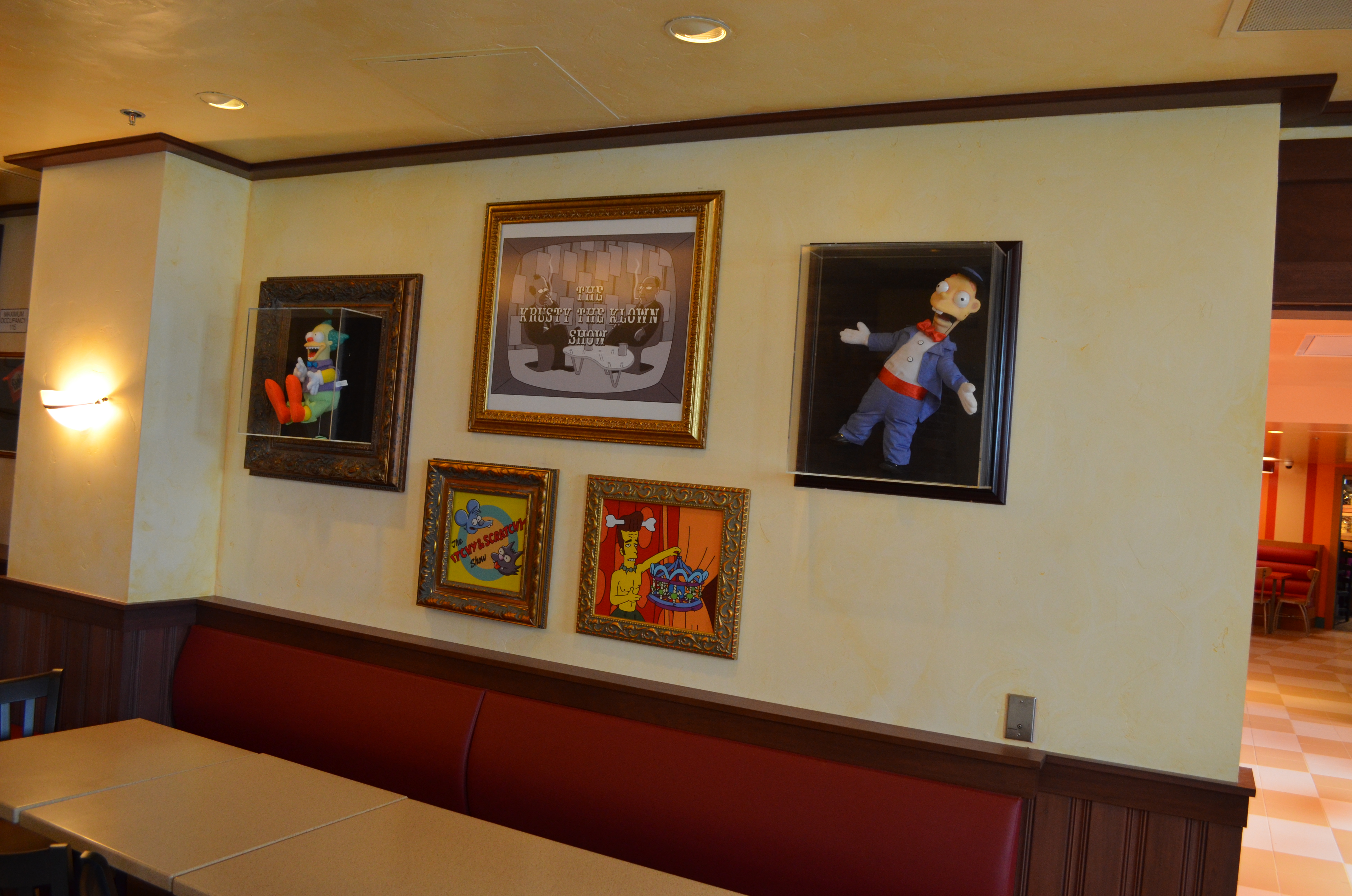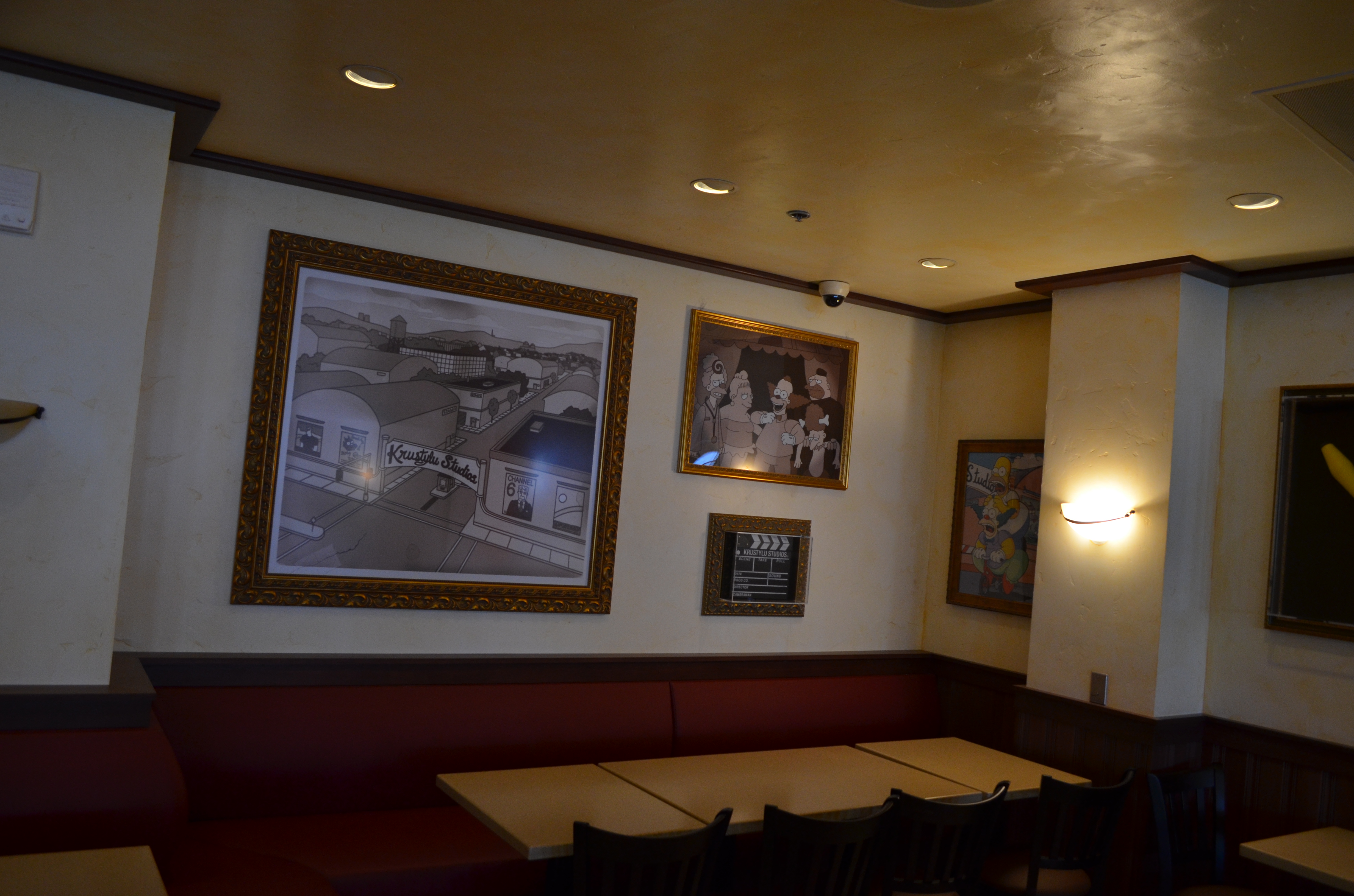 Stairs in Cletus’ and Krusty Burger take guests upstairs. Two of the rooms are themed to those restaurants, and the third is themed to the Krustly Lu’ Studios lounge. There are no windows over looking the streets of Springfield, but small frosted windows are located in the back of each room. Each of these themed restaurants and dining rooms are wonderful and so immersive, you forget you are in the theme park.