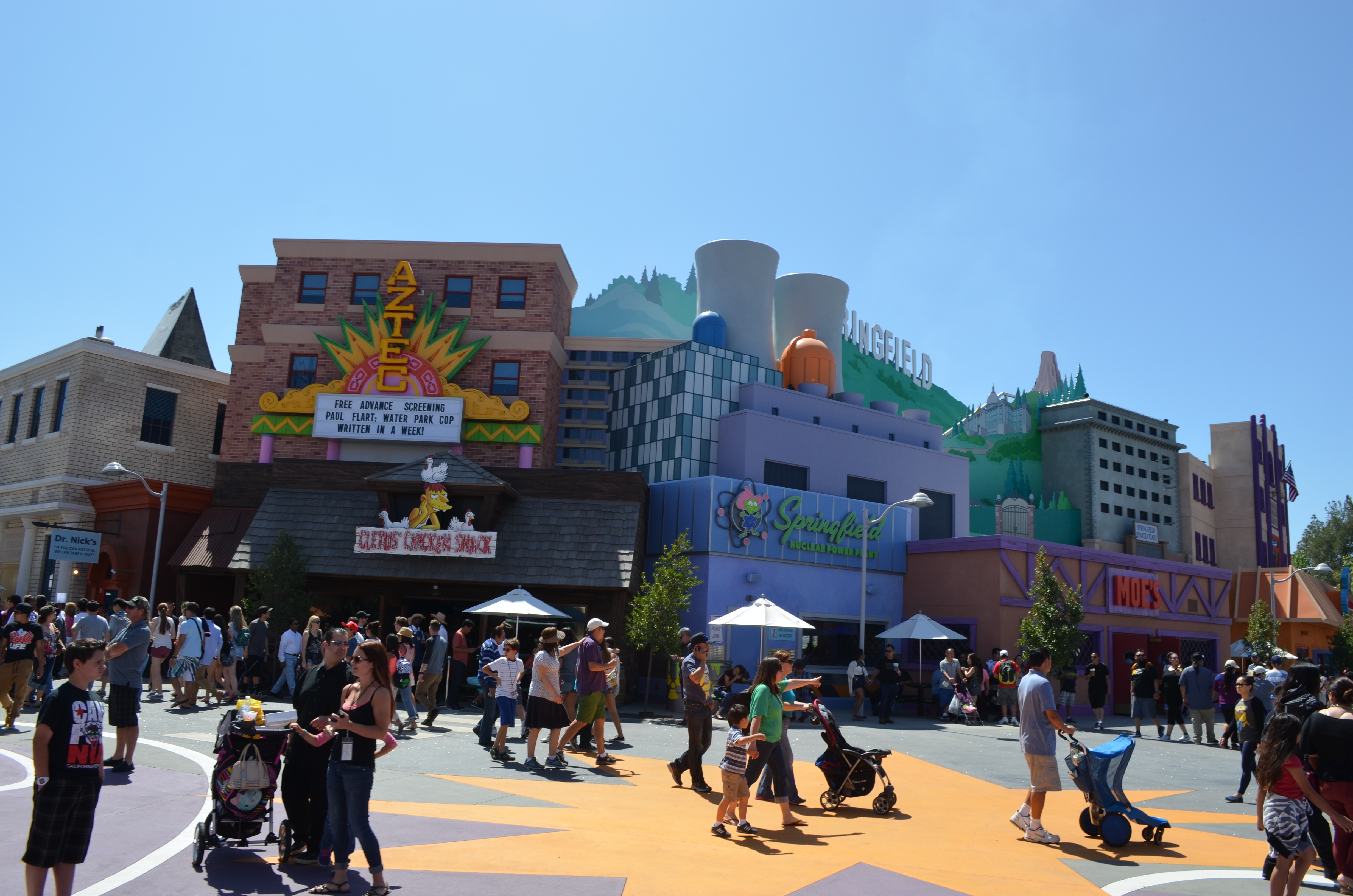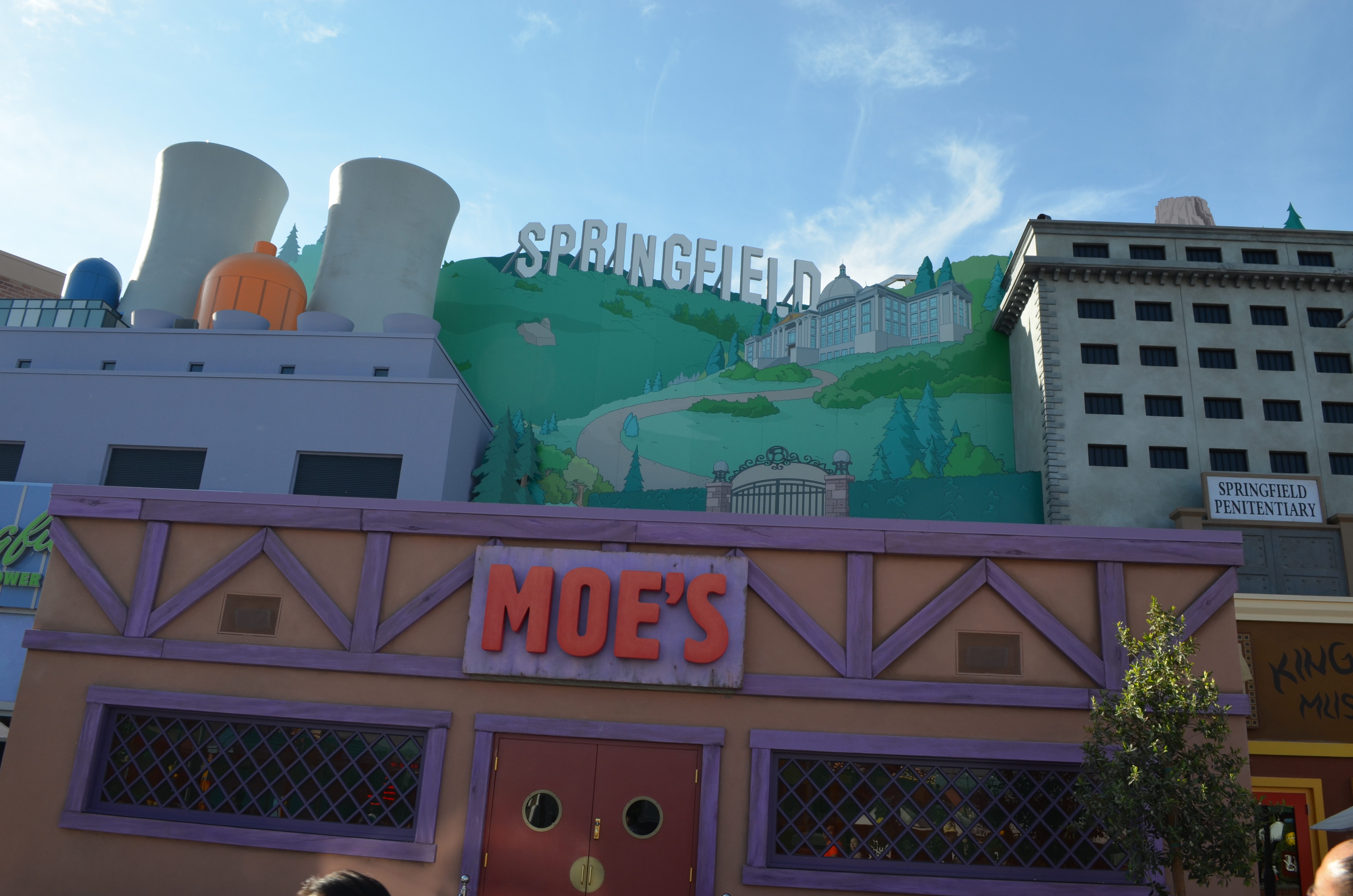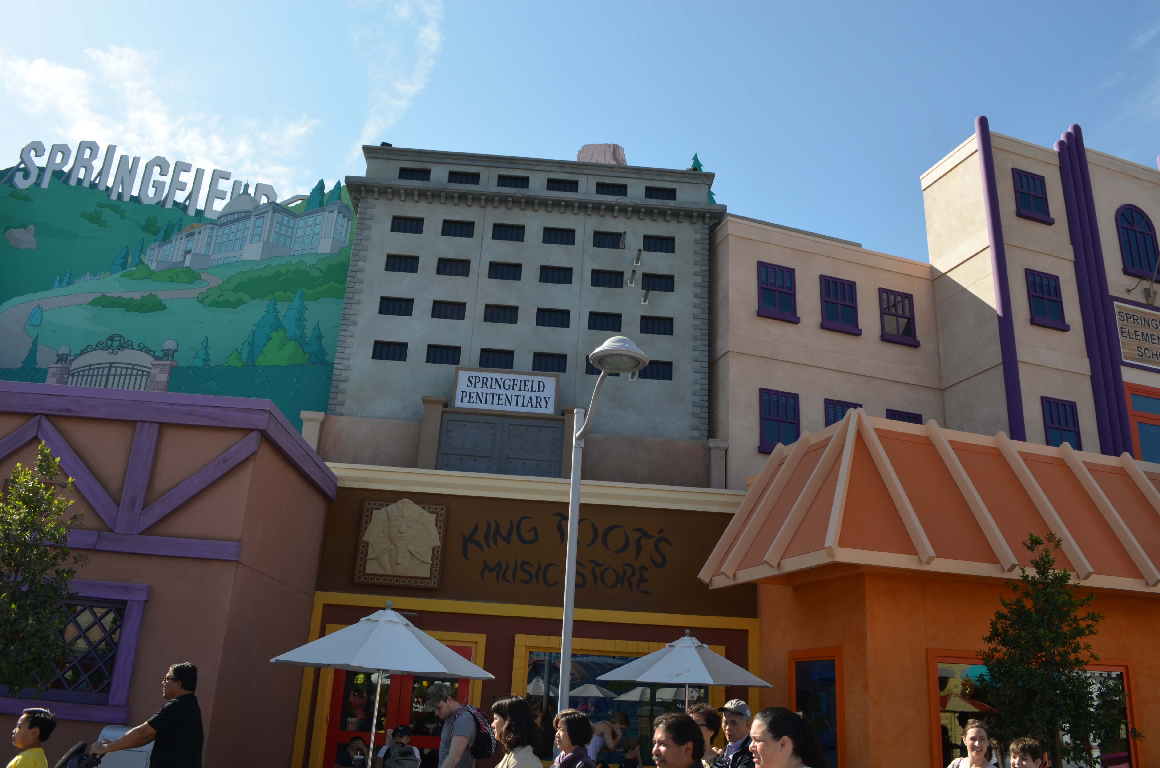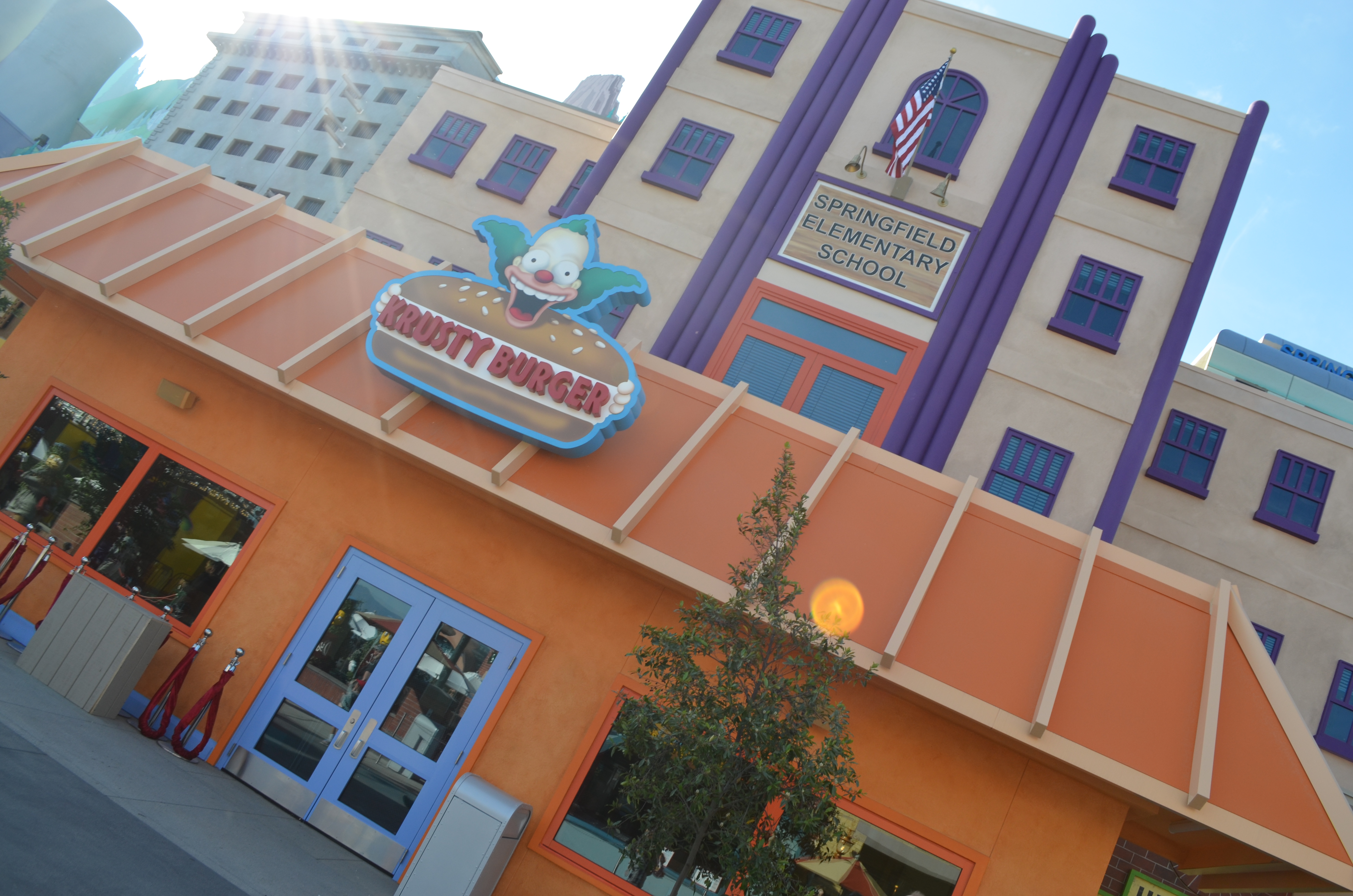 Springfield, home to the Simpsons, has recently opened at Universal Studios Hollywood. The characters have existed in the park since the Simpsons Ride opened in 2008. At the time, the surrounding area was known as Simpson’s Plaza and featured the ride and a good shop from the series, The Kwiki Mart. The adjacent buildings were various food and dining areas, such as the beloved Doc Brown’s Chicken. In early 2014, those adjacent shops and restaurants were closed and quickly demolished and in the short time frame of 15 months, Springfield took its place.