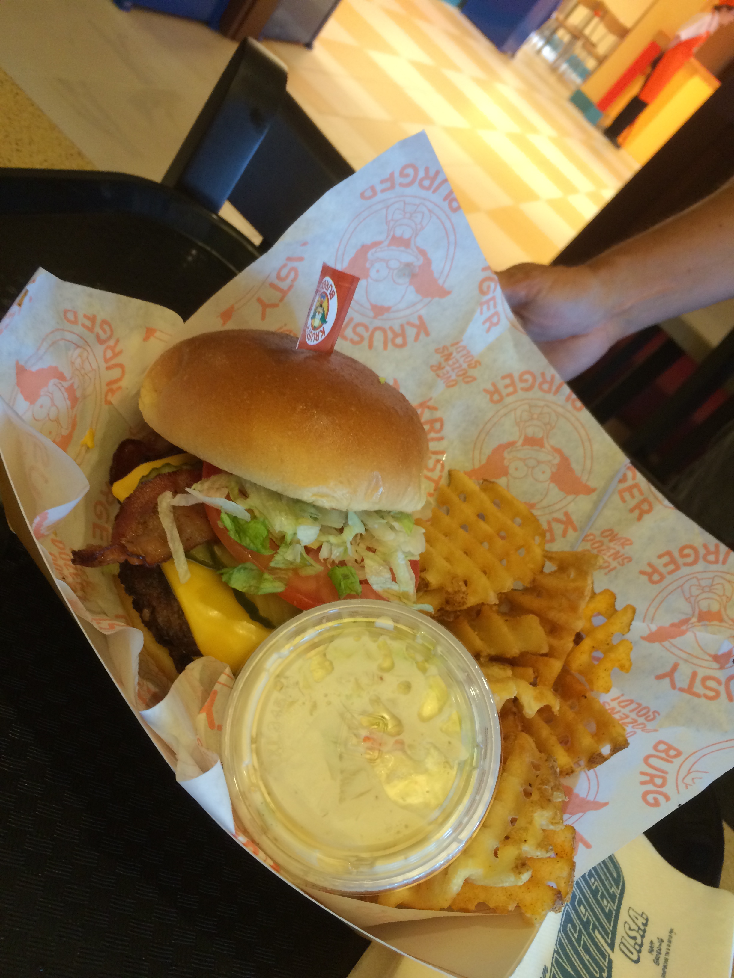 When we went to the park, we tried food from the two main venues. The Krusty Burger was really good. Definitely surprising for theme park food, it was one of the better burgers we’ve had. The Chicken & Waffle Sandwich was one of the best sandwiches I’ve ever had. The sweat syrup sauce needs to be sold in bottles, it’s that good! On the other hand, the waffle cut fries were rock hard and were practically uneatable. Hopefully they will be improved soon. Inside the building are multiple Coke Freestyle machines for refills, so you wont need to go back to the first floor for refills.