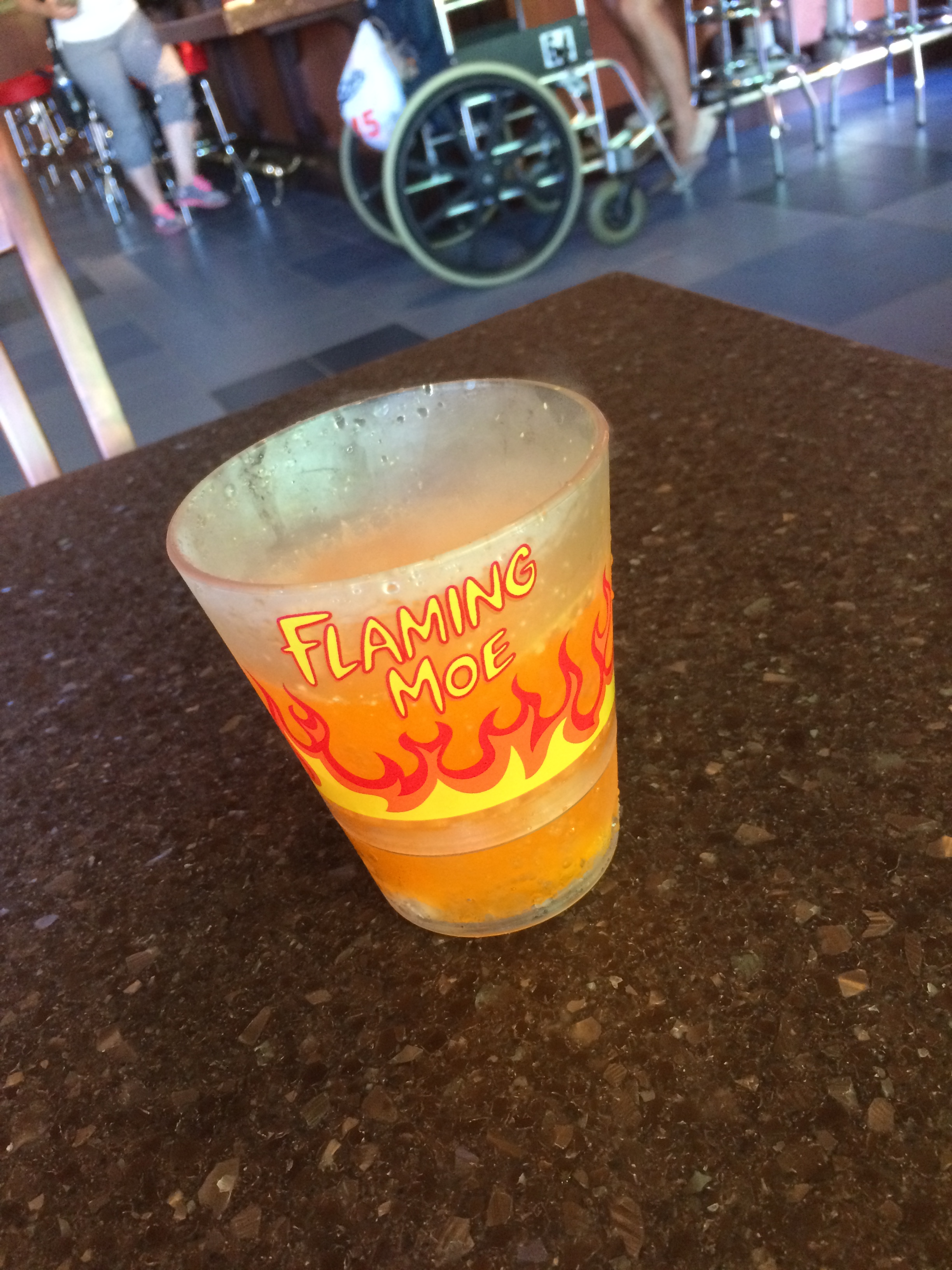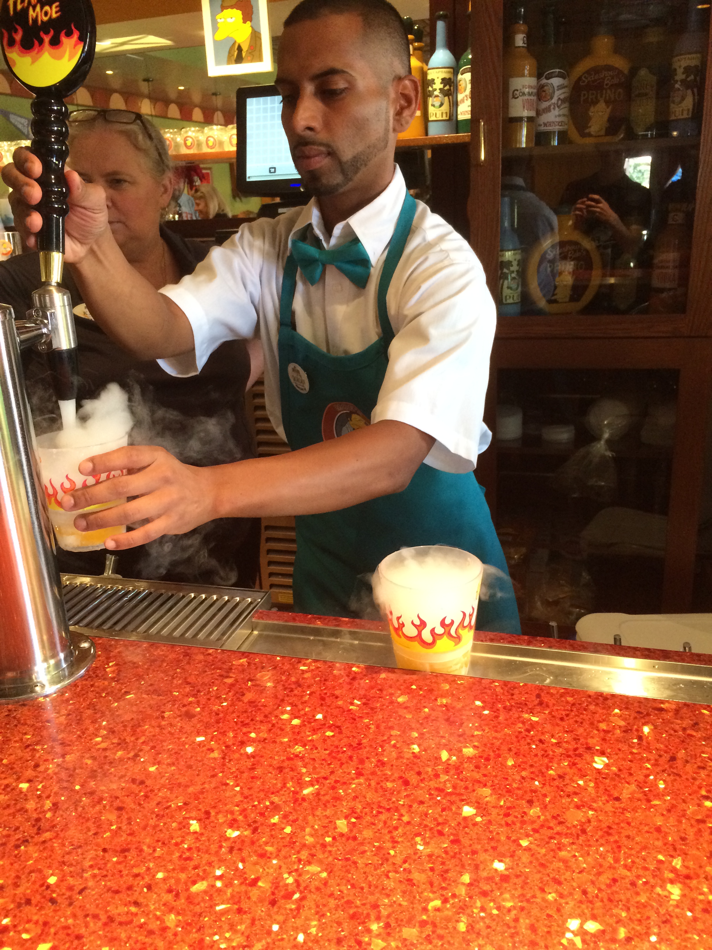 On the ground floor is Moe’s Tavern. Here you can enjoy a Duff Beer or a Flaming Moe. The Flaming Moe is a Fanta soda drink in with dry ice in a souvenir cup, but at $9 its really expansive for the size of the drink.