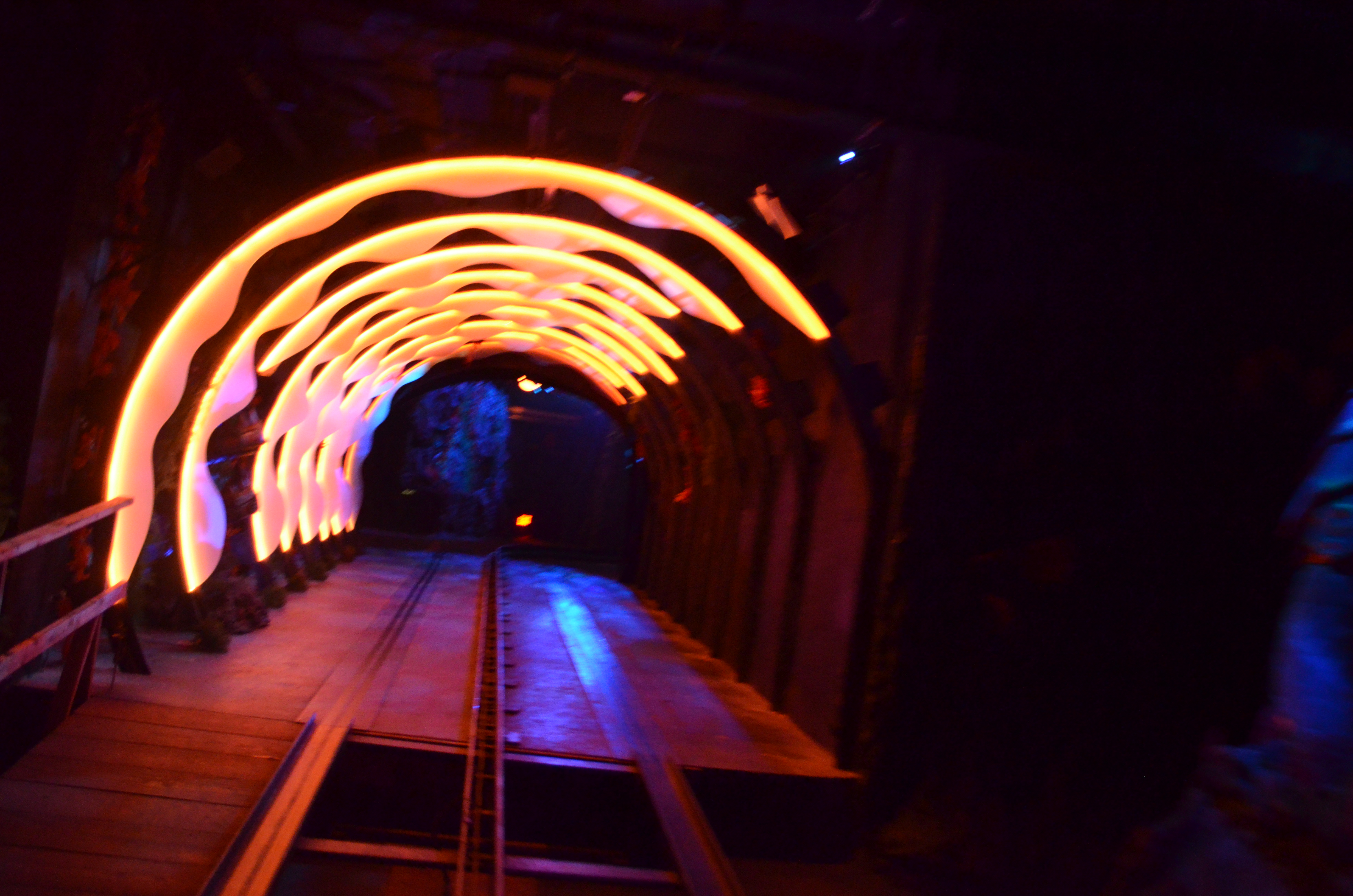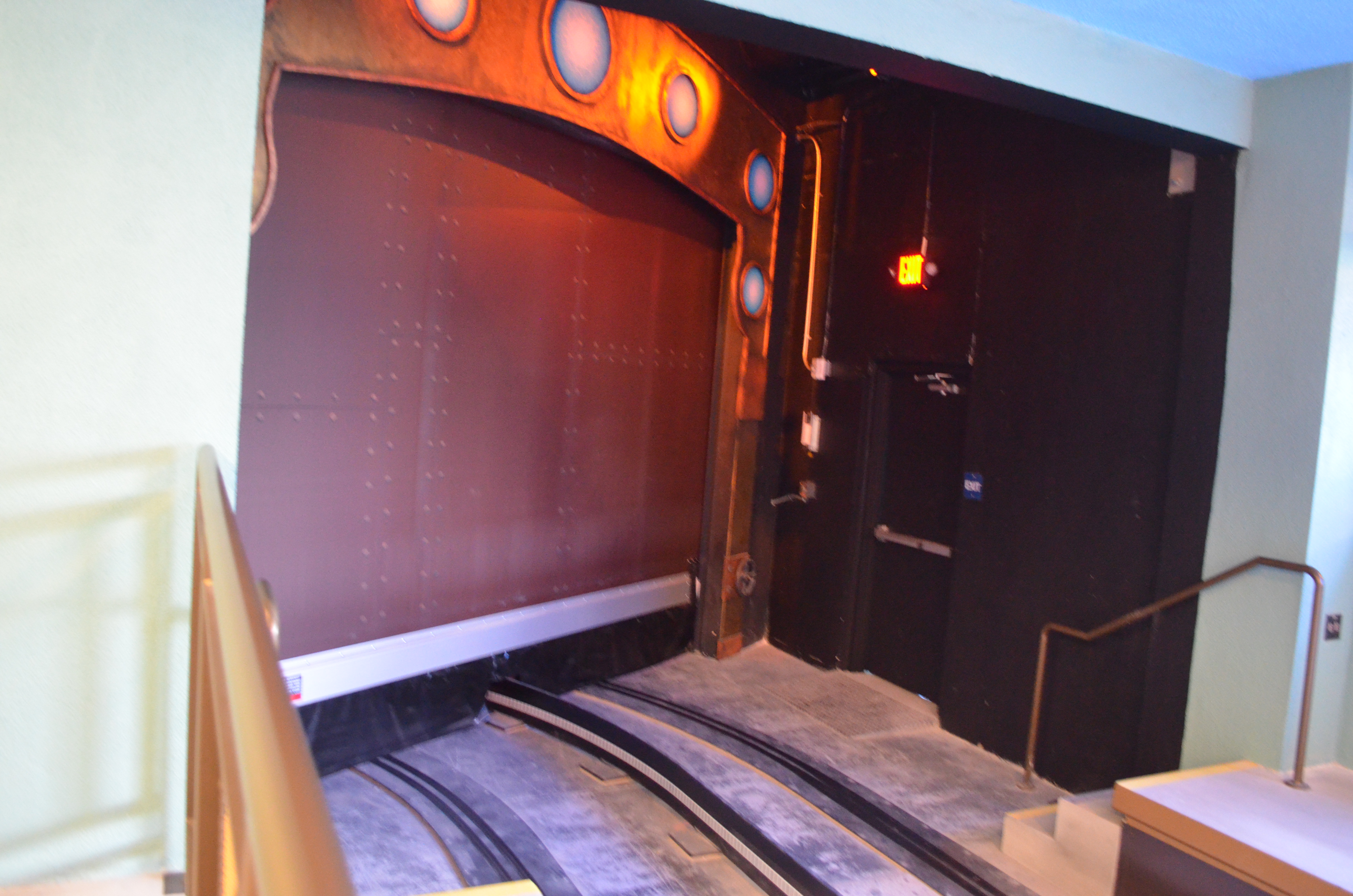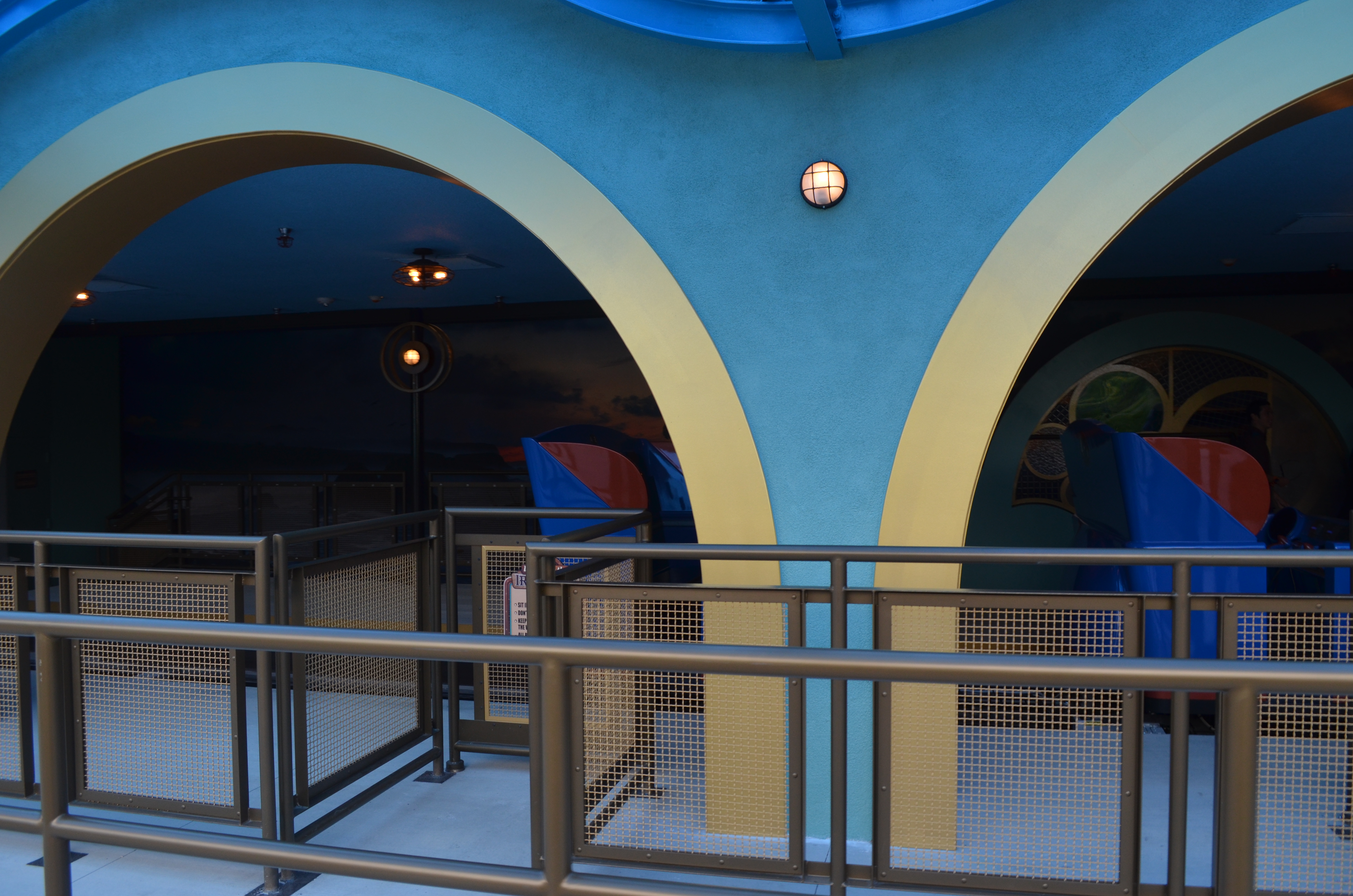 The loading platform is enclosed with four beautiful arches and a new mural at the back end. The submarined themed ride vehicles are very unique. Each rider has a blaster and have a different color pop up on the screen when they are firing. The front half slides forward to allow guests to enter. The cars also feature 360˚ spinning to allow the cars to face the screens. Each car seats four and there are two cars in a train, with a total of eight trains. The ride has a maximum capacity of 800 people per hour, more on this in a bit. From here, the train rolls forward and a speed door rolls up.