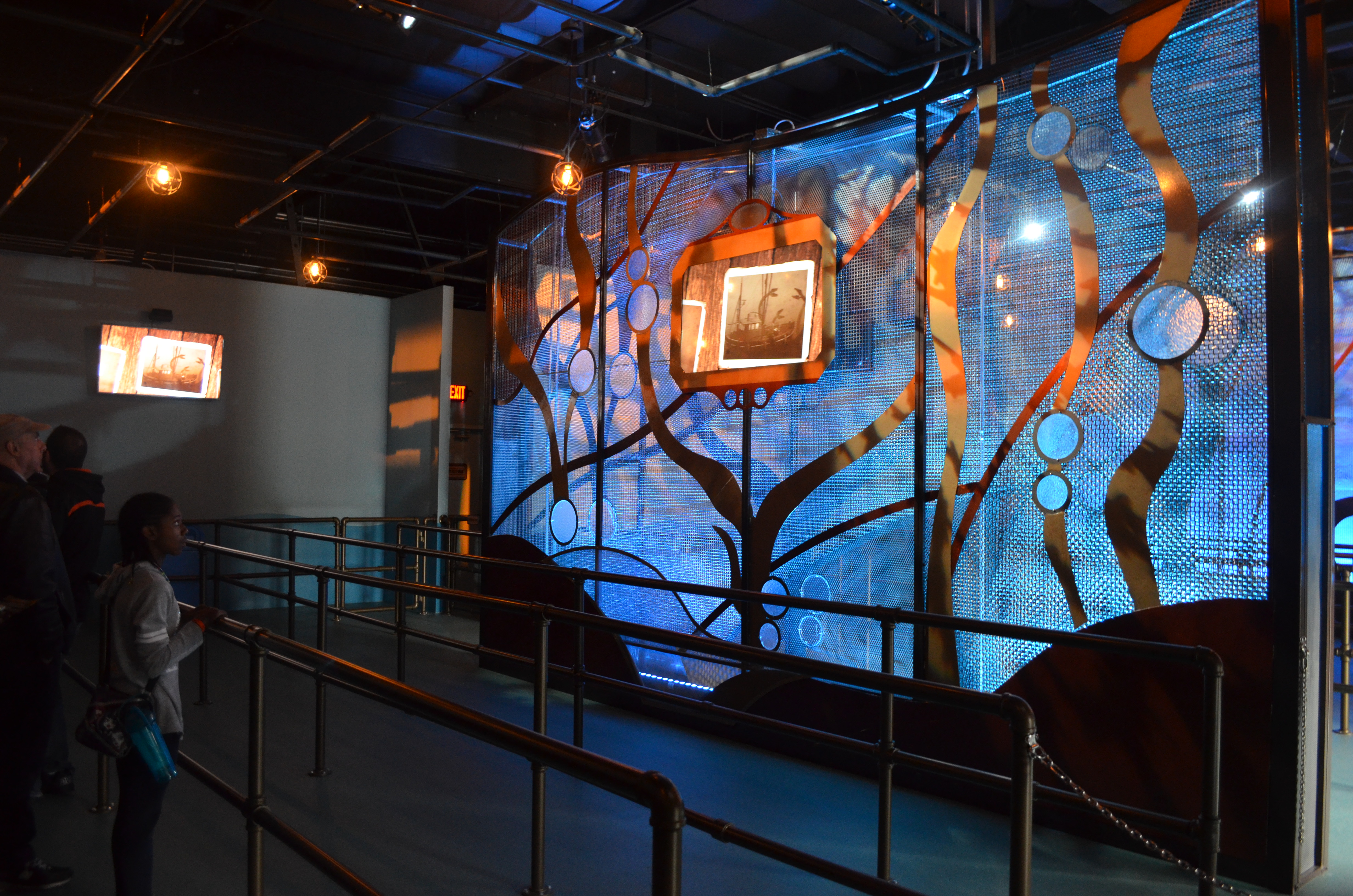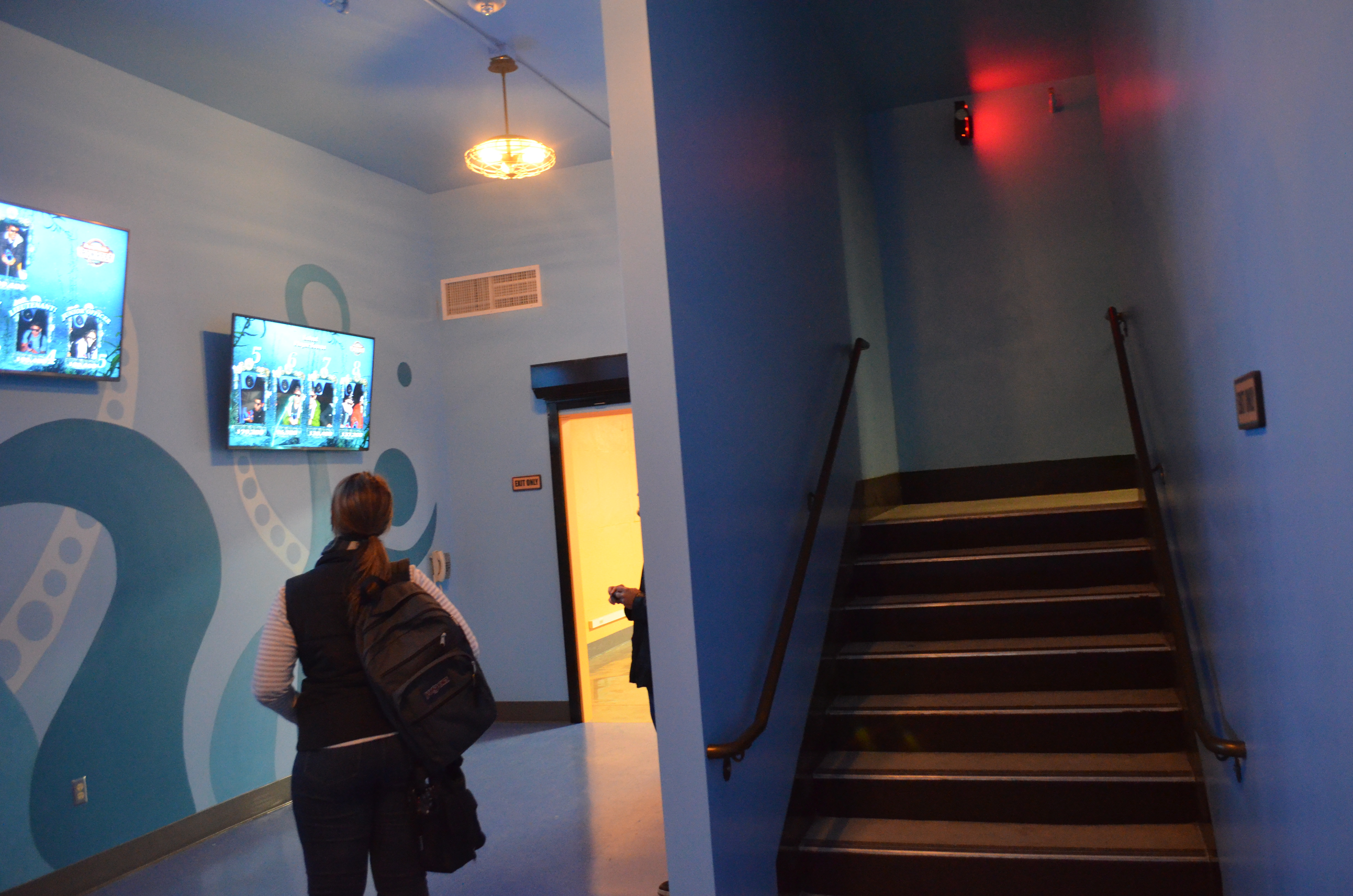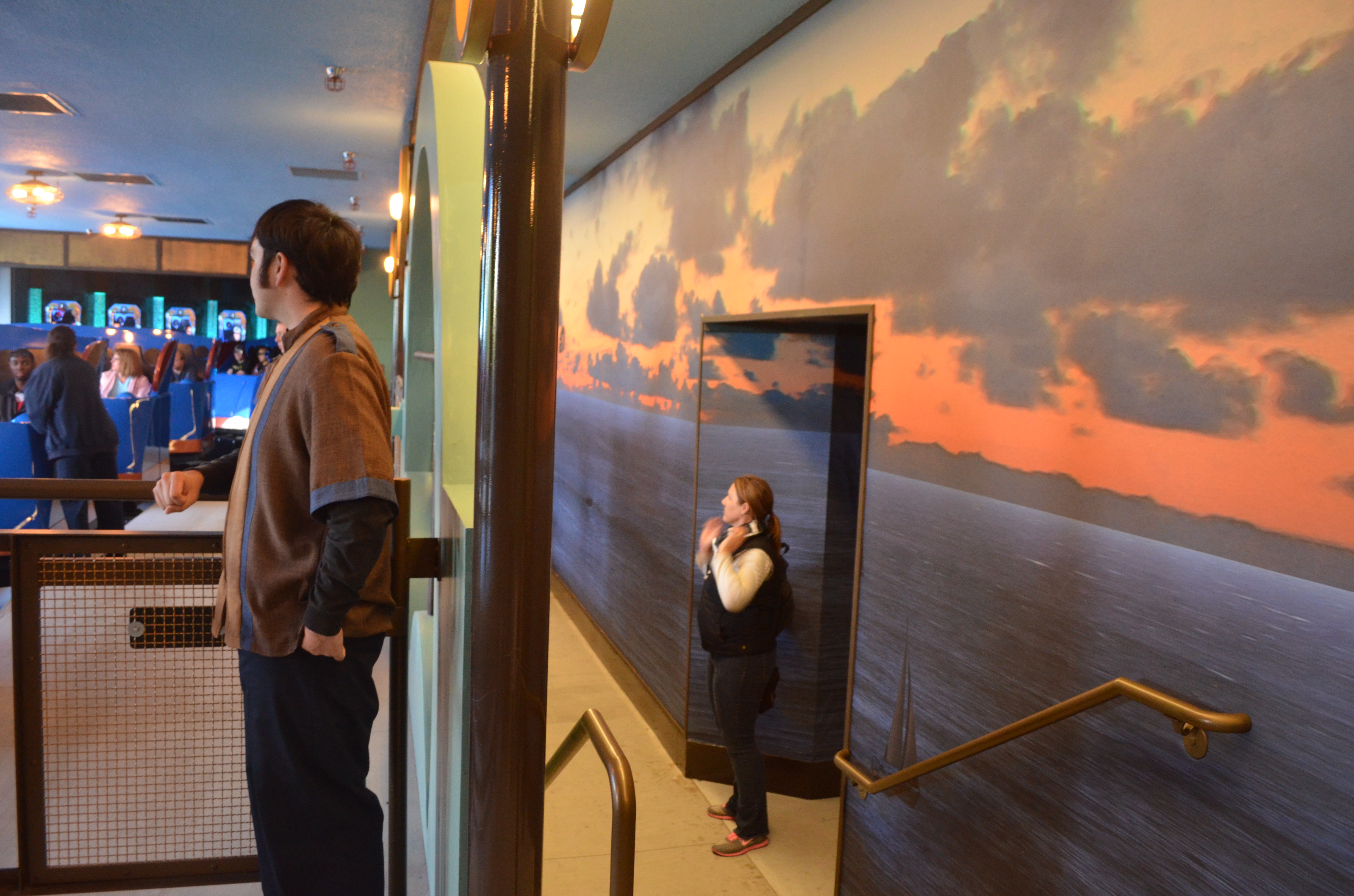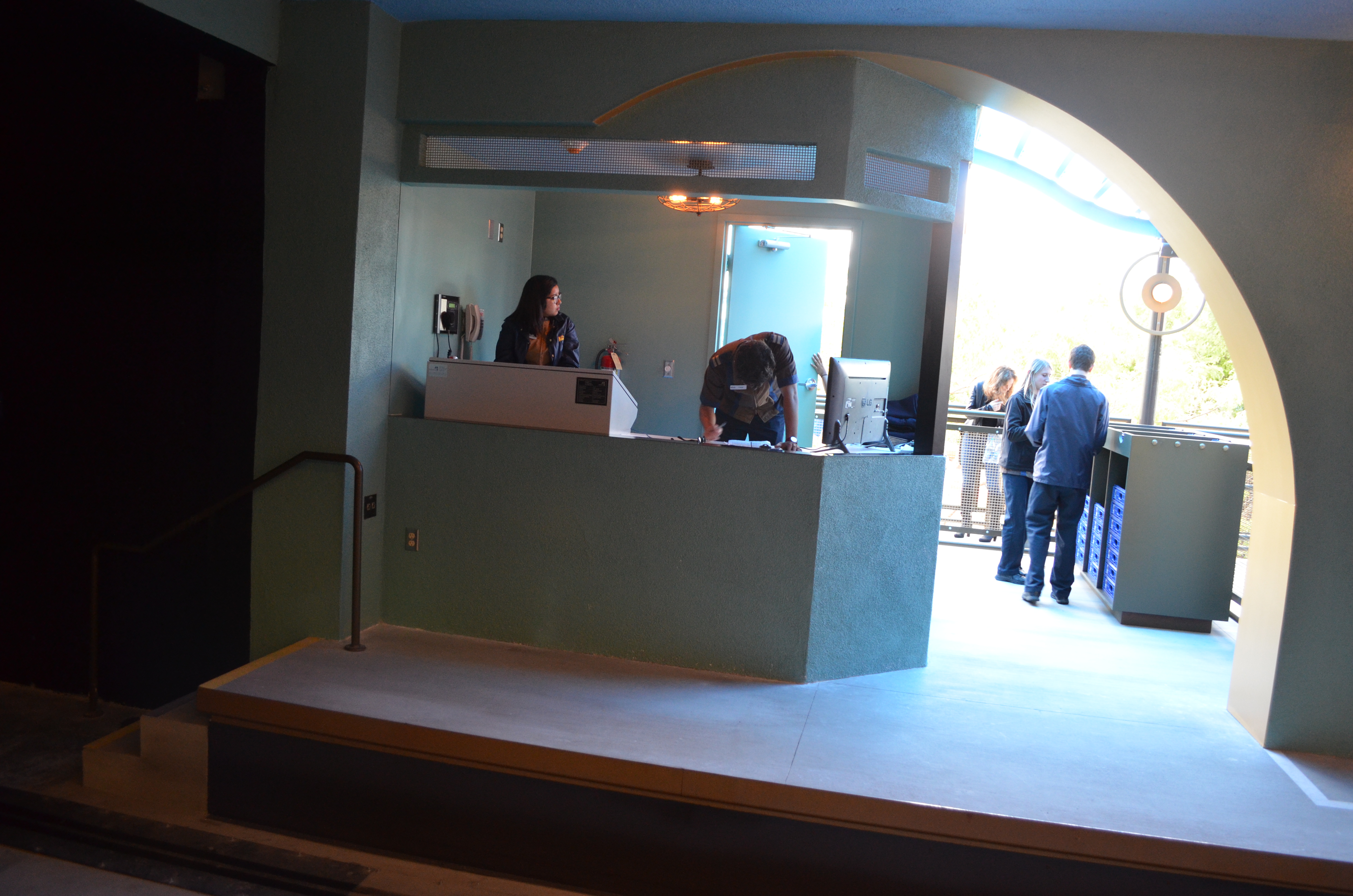 The loading platform is enclosed with four beautiful arches and a new mural at the back end. The submarined themed ride vehicles are very unique. Each rider has a blaster and have a different color pop up on the screen when they are firing. The front half slides forward to allow guests to enter. The cars also feature 360˚ spinning to allow the cars to face the screens. Each car seats four and there are two cars in a train, with a total of eight trains. The ride has a maximum capacity of 800 people per hour, more on this in a bit. From here, the train rolls forward and a speed door rolls up.