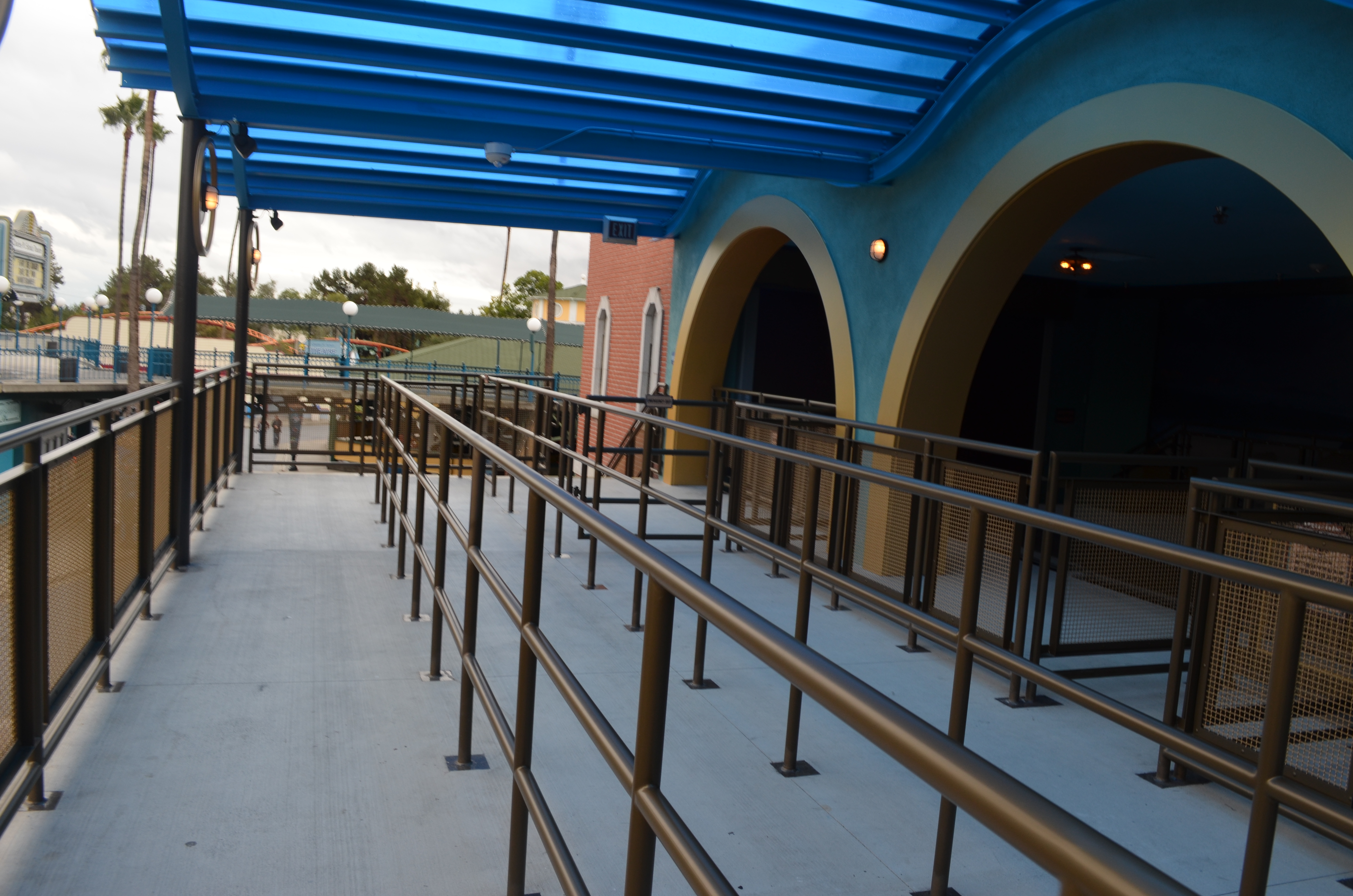 Iron Reef features an outdoor queue and a staircase that leads to the upstairs indoor queue with the ride’s preshow. From here, you walk across a ramp to the large platform with a small queue, receive your 3D glasses, then board the ride vehicles. There is a separate staircase for Fast Lane users, but unfortunately there is no single rider line as of now.