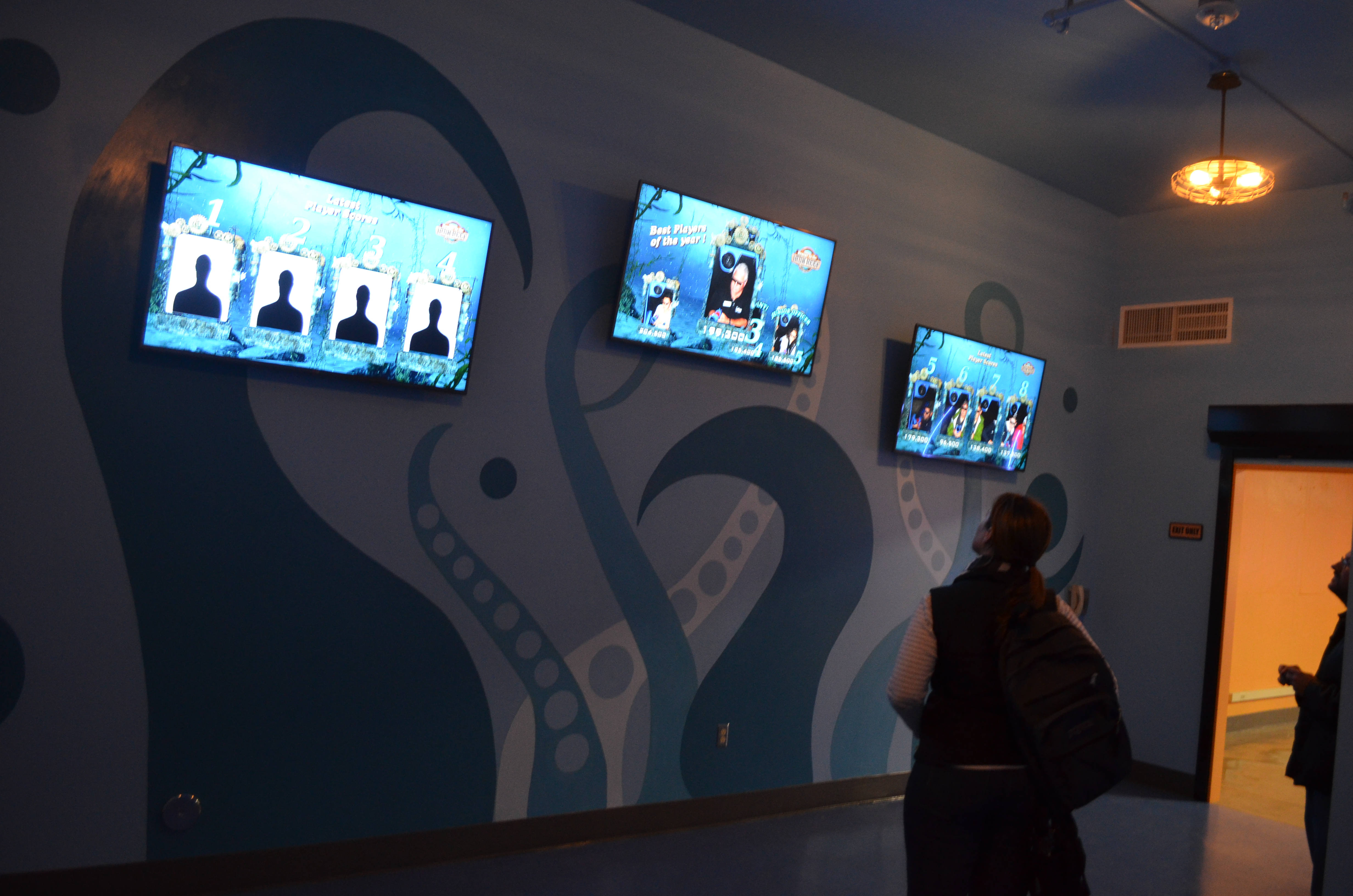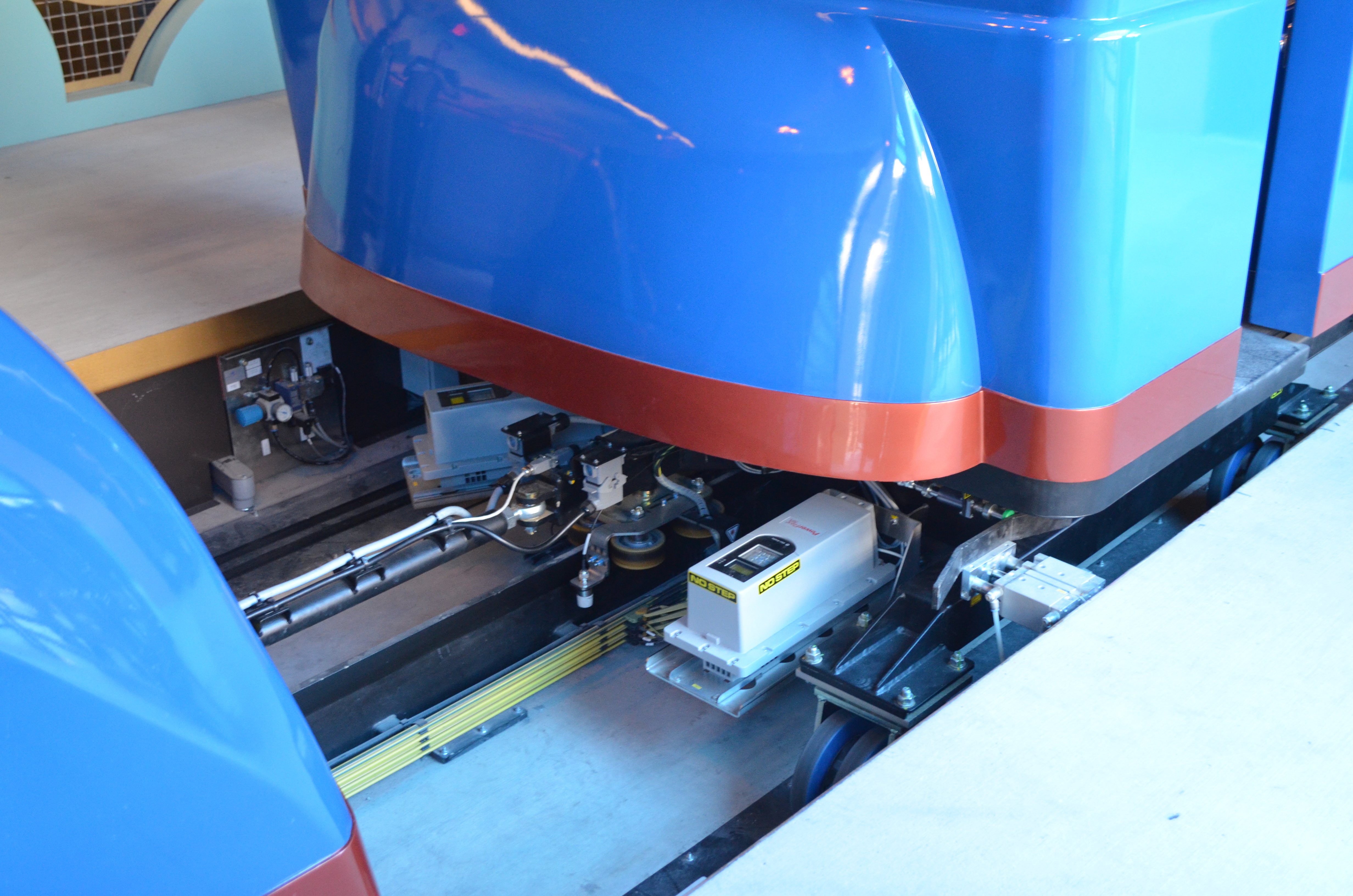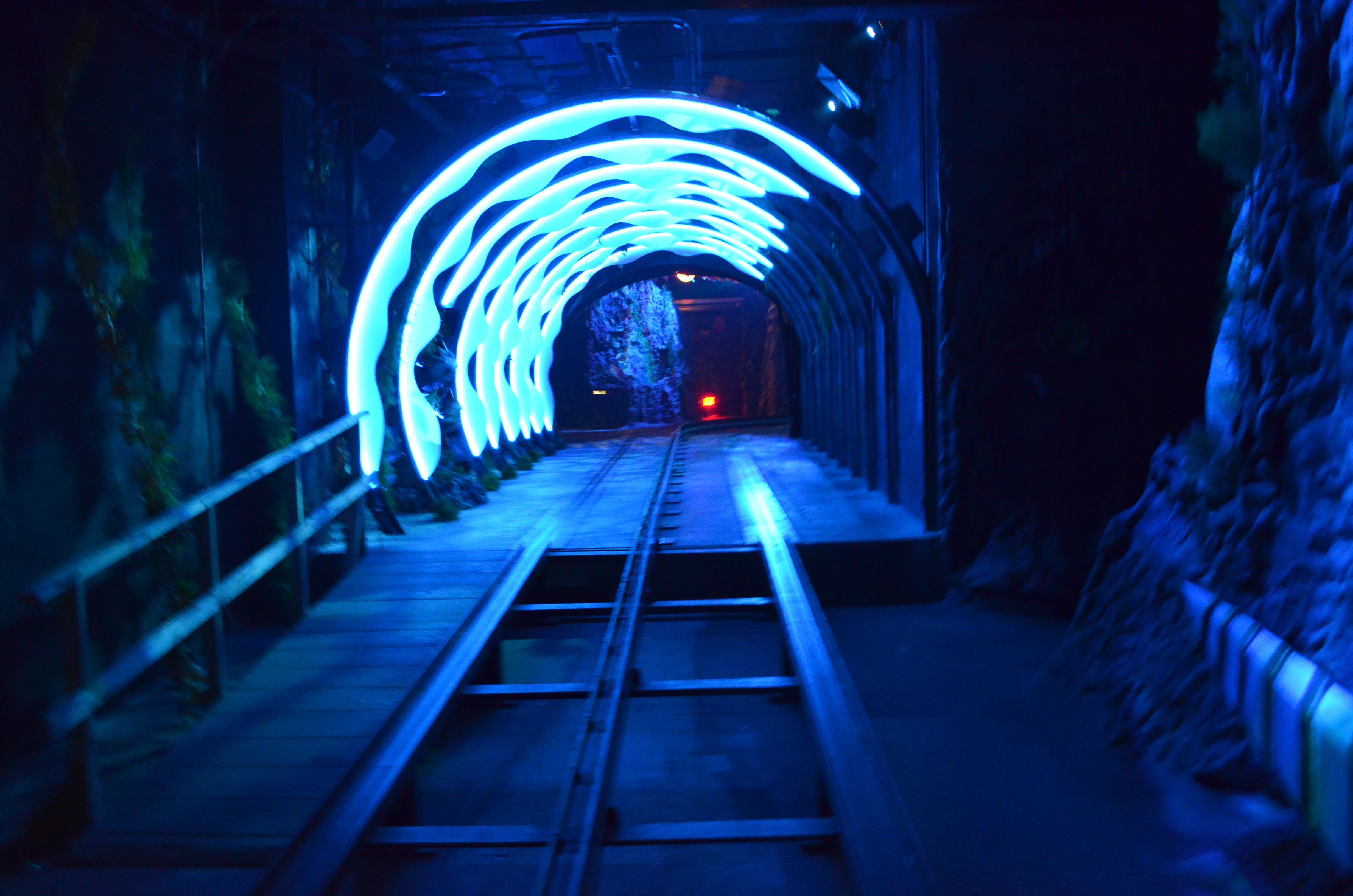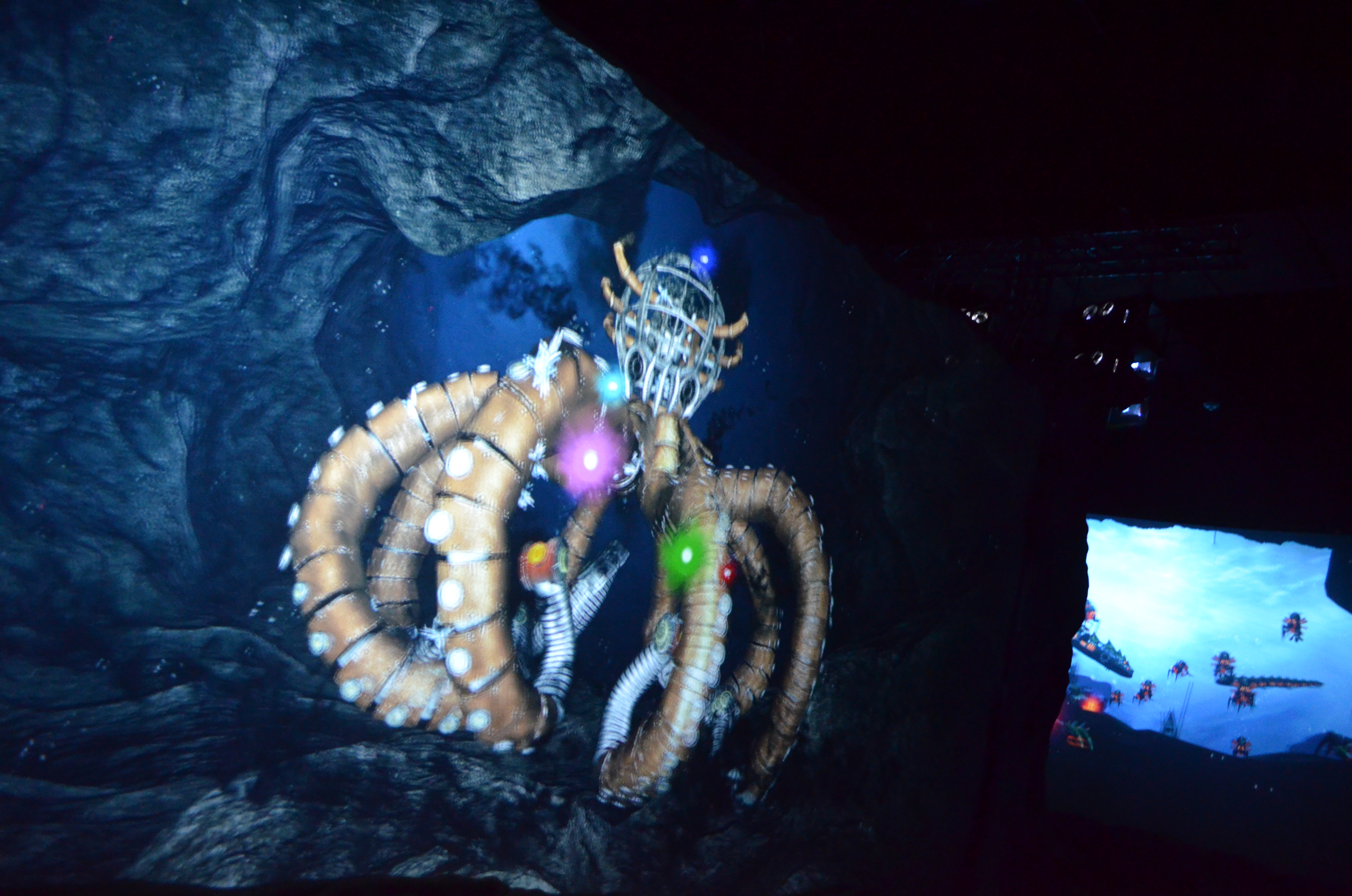 The next few screens have more and more creatures and even some easter eggs, such as the old ‘Roaring 20’s’ sign and others. You travel down a tunnel, the insides of a steampunk fish, with LED lighting and an animated eel figure. The next screens take place inside the Kraken Queen’s lair. A large sunken ship set piece is here connecting two screens. A large seventy foot wrap around screen leads to the finale. You vehicle faces the queen flying out at you and your vehicle spins around to face a massive concave screen. This screen wraps above you as you have a final face off with the villain until she is defeated. Your cars pass the track switch that leads to the maintenance shops, and now pass through another speed door and can see everyone’s score along with an on ride picture.