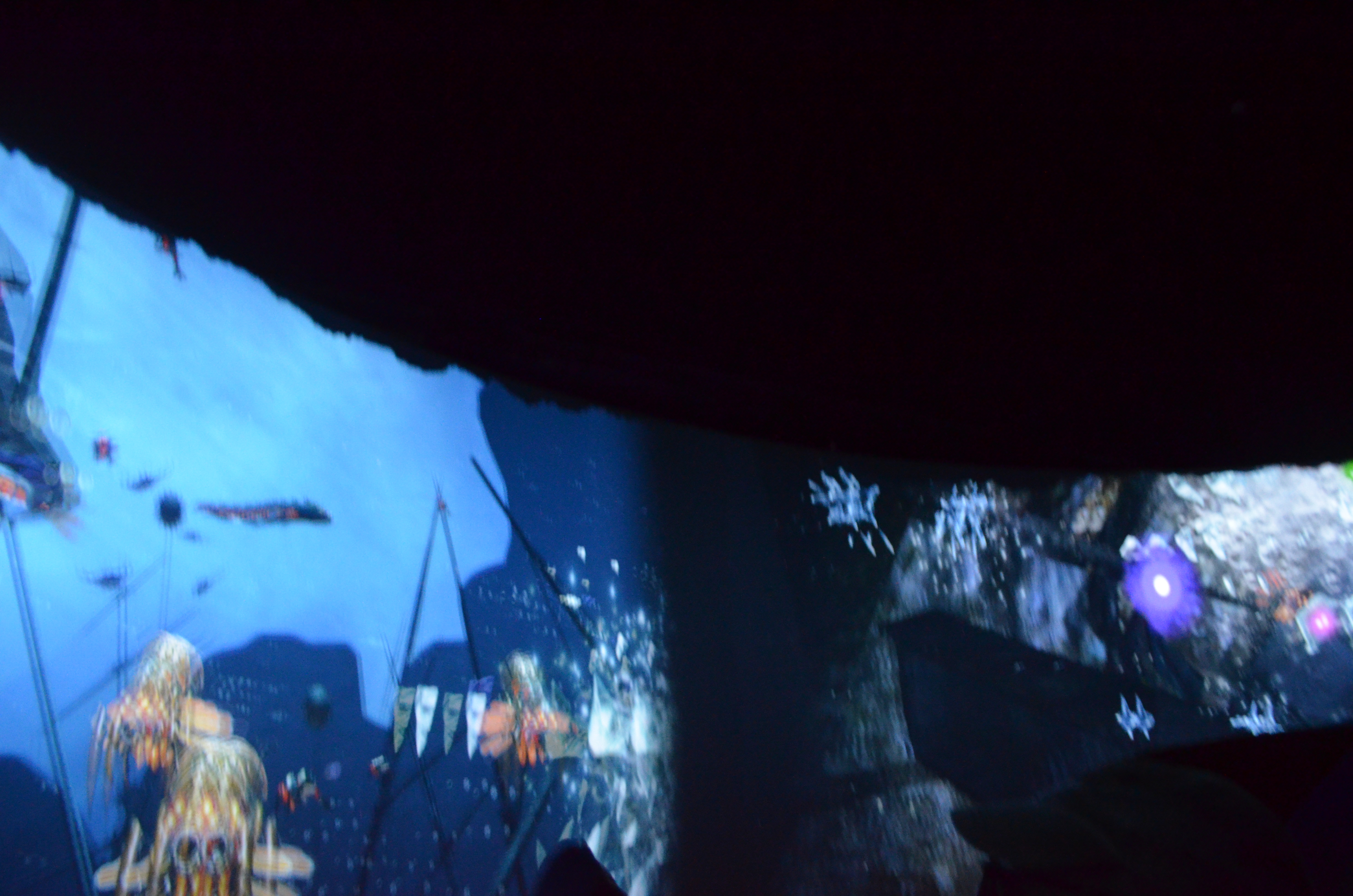 May 2015 Iron Reef was built by Canada based Triotech, the same group behind Wonder Mountain’s Guardian, their first project. It is very clear after riding Iron Reef that they learned a lot after Guardian. Instead of there being a coaster section, they focused completely on the dark ride aspect. There are also physical sets, bridging the blank gap between screens.