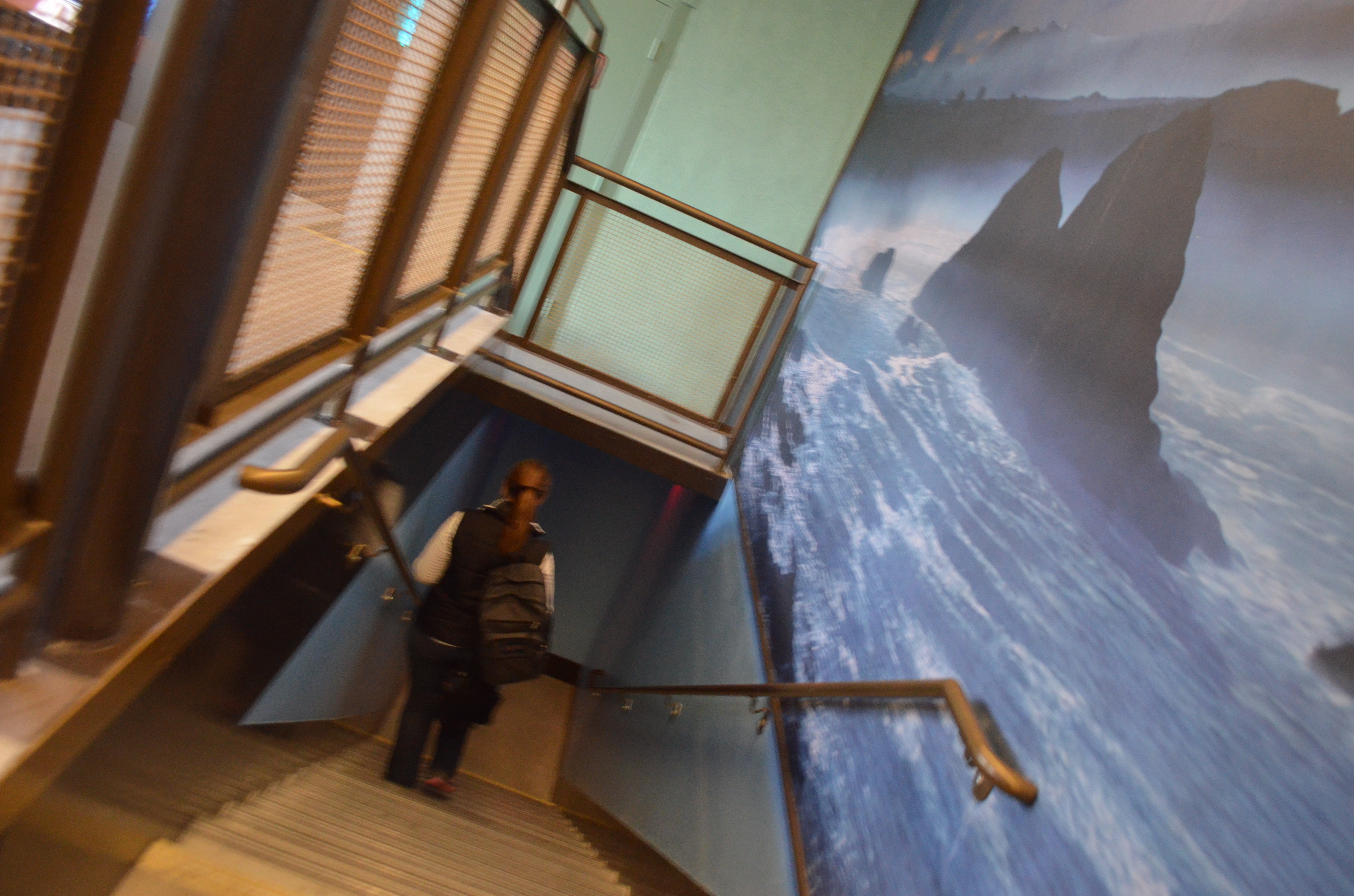 We enter the first scene, a large boiler and fan are on both sides. Another door opens up and we meet the first screen. There are gears behind us and set the scene of being in lift. The animation depicts the vehicle diving under the water. We rotate and now face a fog curtain with a cool effect of use underwater.