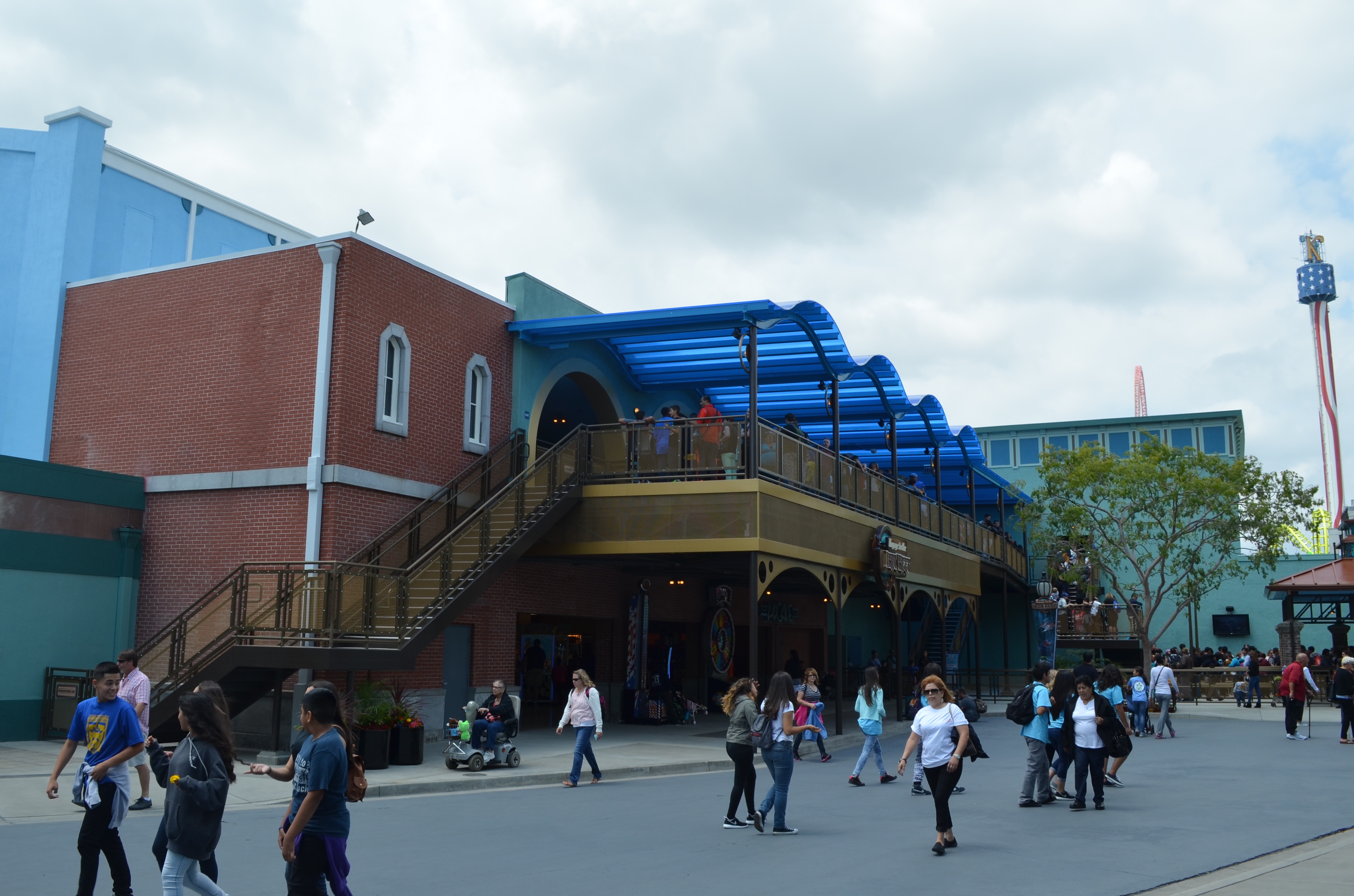 The ride is located on the second floor of a forty year old show building. This location has been home to two other dark rides, Knott’s Bear-y Tales (1975) and Kingdom of the Dinosaurs (1986). The latter was a quick, prehistoric remodel of Bear-y Tales and used the same ride layout. Kingdom of the Dinosaurs closed for good in 2004 and the building sat empty until now. Here are some before and after photos of the facade and show building.